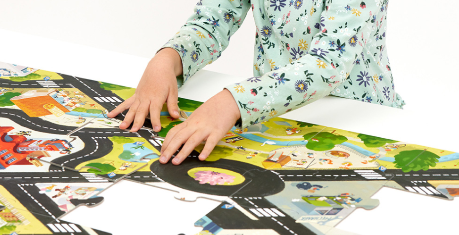 Ogromne podłogowe puzzle tworzą plan miasteczka z mnóstwem dróg, po których można jeździć zabawkowymi samochodzikami.