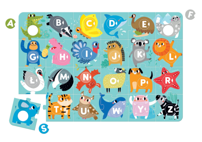 A jak Aligator, B jak...? Na jaką literę jest Mrówkojad? Czas na literkową przygodę! Duża edukacyjna układanka przedstawia zwierzątka na kolejne litery alfabetu. Składa się z 48 elementów: 24 tradycyjnych puzzli i 24 wyjmowanych kółeczek z literami, które należy dopasować do odpowiednich dziurek. To świetny pomysł na kreatywną zabawę oraz wprowadzenie do świata liter.