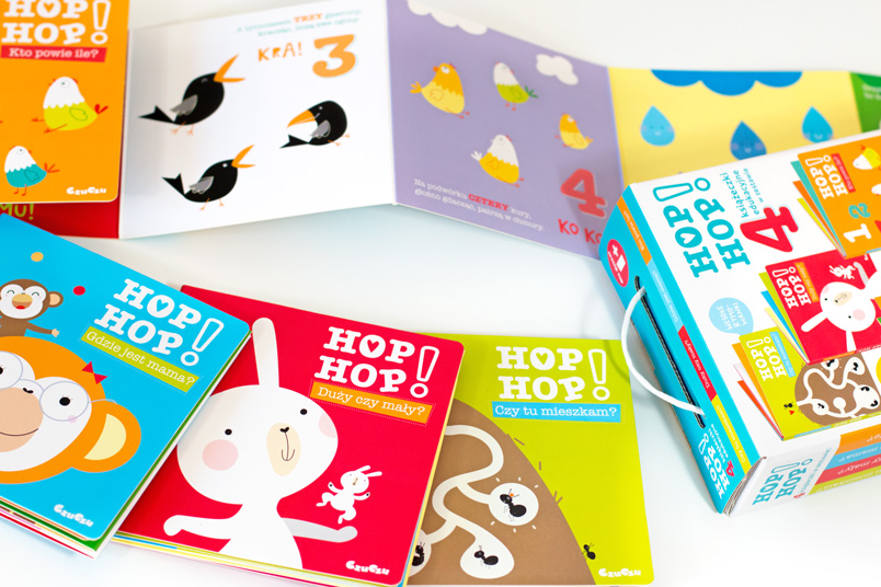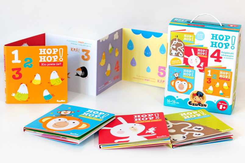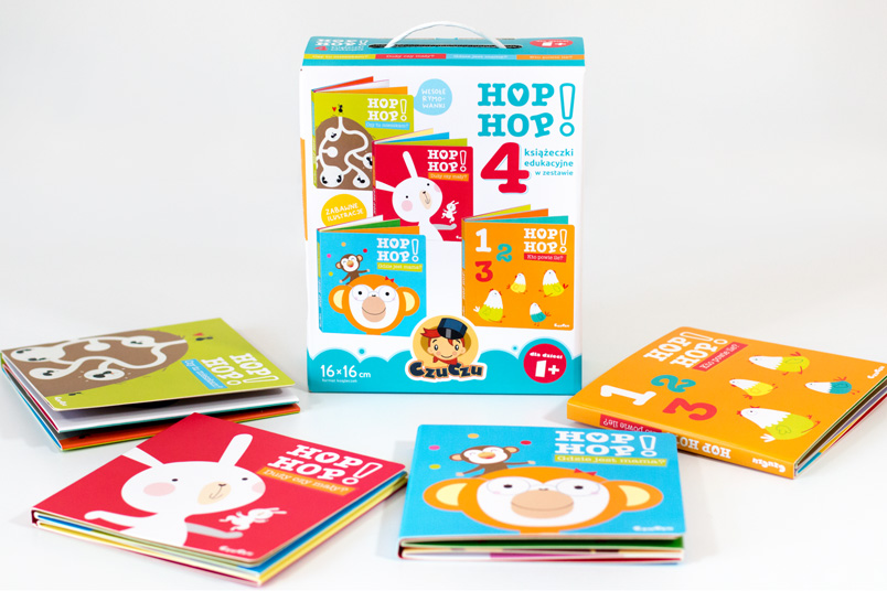 CzuCzu Hop, hop! to zestaw obejmujący serię czterech zabawnie ilustrowanych i pełnych rymów książek harmonijek dla najmłodszych czytelników. Dzięki nim dzieci dowiedzą się, gdzie mieszkają zwierzęta i jak wyglądają ich mamy, poznają najważniejsze przeciwieństwa oraz nauczą się liczyć do dziesięciu. Zestaw zawiera 4 książki harmonijki.