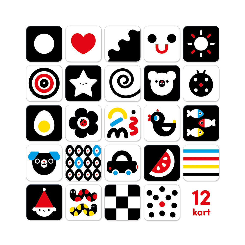 Wyjątkowa cecha: ilustracje są dostosowane do rozwijającego się wzroku niemowląt. Można korzystać z pojedynczych kart lub książeczki.