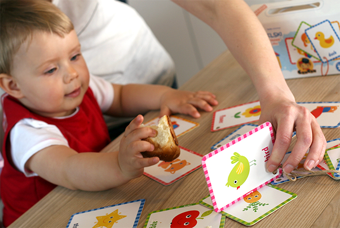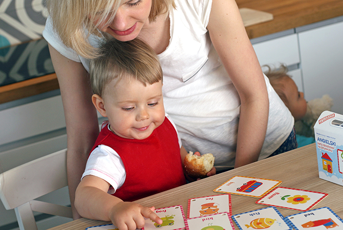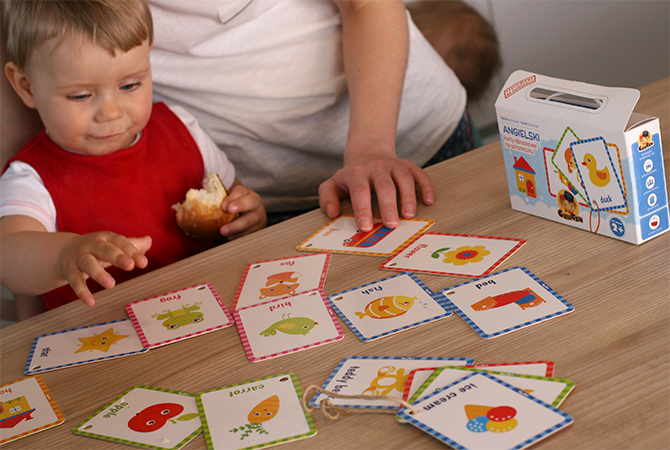 Najlepszą metodą uczenia dzieci języka angielskiego jest wspólna zabawa. Pokazywanie i nazywanie obrazków to okazja do poznania pierwszych angielskich słówek oraz budowania wzajemnych relacji. W zestawie znajdziemy 16 kart obrazkowych na sznureczku.
