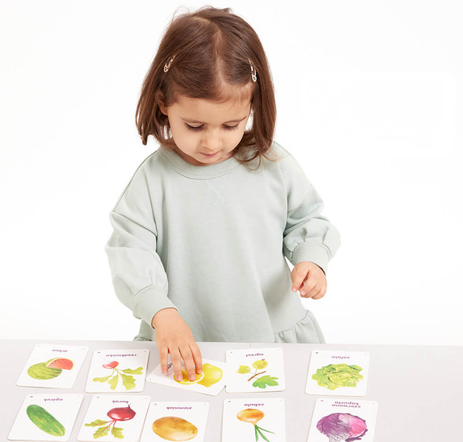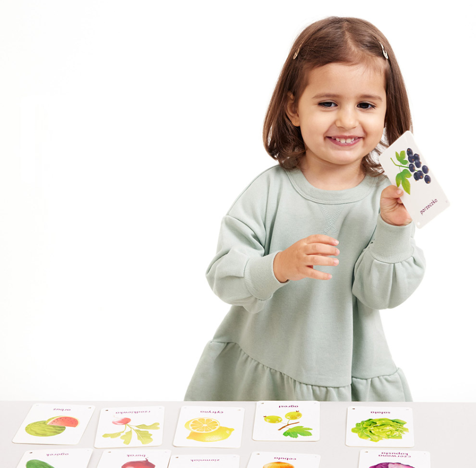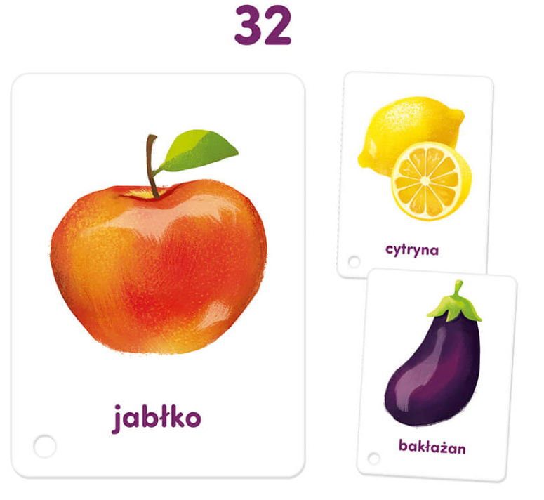 W edukacyjnej książeczce znajdziecie 32 smakowite ilustracje przedstawiające kolorowe warzywa i owoce, które mogą znaleźć się na waszym stole. Karty mają poręczny format i oryginalne łączenie, dzięki czemu możecie korzystać z nich na wiele sposobów i w różnych miejscach. Wspólna zabawa rozwija zmysły i doskonali spostrzegawczość, pamięć i kreatywność.
