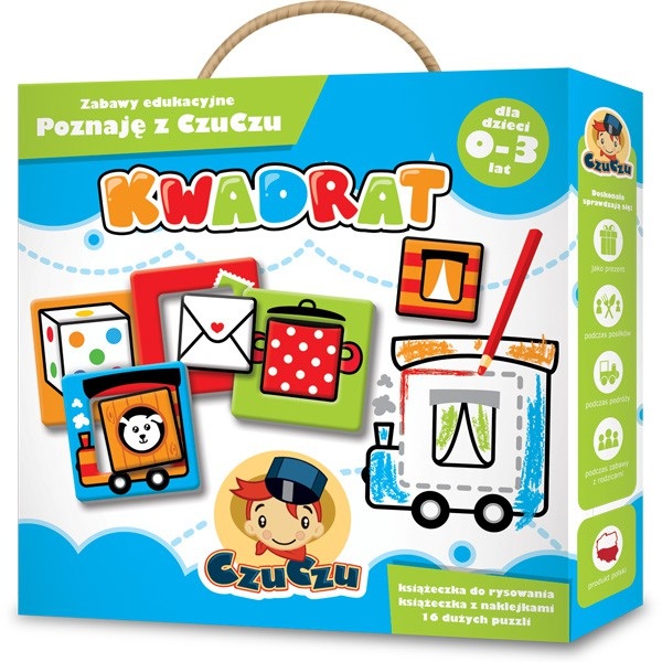 Poznaję z CzuCzu kwadrat to kreatywny zestaw dla najmłodszych dzieci. W zestawie znajdują się: książeczka do rysowania, książeczka z naklejkami oraz 16 grubych puzzli.