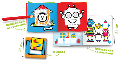 Książeczka z naklejkami jest kontynuacją zabawy z puzzlami. Dzieci, szukając odpowiedniego miejsca dla naklejki i uzupełniając obrazki, ćwiczą spostrzegawczość, koncentrację uwagi i precyzję ruchów. Książeczka do rysowania jest kontynuacją zabawy z puzzlami. Uzupełnianie ilustracji to zabawa z kolorami i ćwiczenie prawidłowego chwytu kredki. Rysowanie po śladzie doskonali u dzieci precyzję i wydłuża czas skupienia uwagi. Bawiąc się puzzlami dziecko poznaje podstawowe kształty, realizuje własne pomysły oraz rozwija umiejętność logicznego myślenia i kojarzenia.