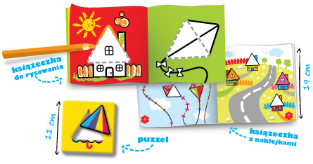 Książeczka z naklejkami jest kontynuacją zabawy z puzzlami. Dzieci, szukając odpowiedniego miejsca dla naklejki i uzupełniając obrazki, ćwiczą spostrzegawczość, koncentrację uwagi i precyzję ruchów. Książeczka do rysowania jest kontynuacją zabawy z puzzlami. Uzupełnianie ilustracji to zabawa z kolorami i ćwiczenie prawidłowego chwytu kredki. Rysowanie po śladzie doskonali u dzieci precyzję i wydłuża czas skupienia uwagi. Bawiąc się puzzlami dziecko poznaje podstawowe kształty, realizuje własne pomysły oraz rozwija umiejętność logicznego myślenia i kojarzenia.