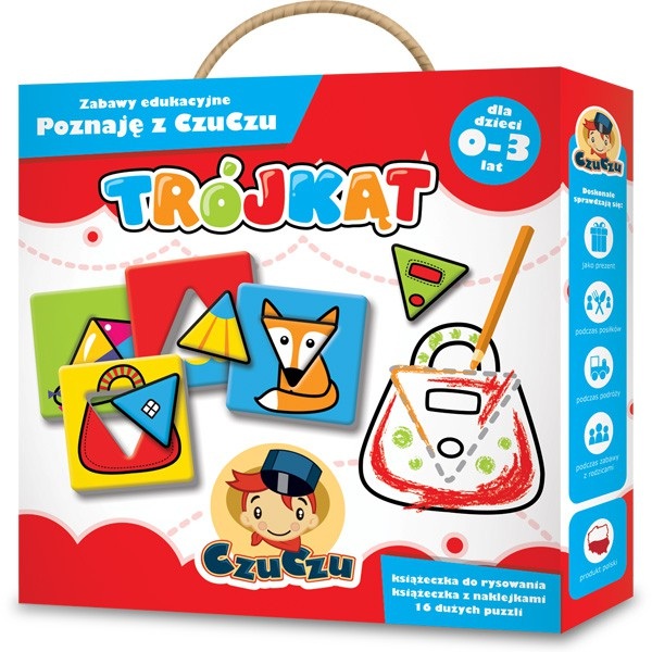 Poznaję z CzuCzu trójkąt to kreatywny zestaw dla najmłodszych dzieci. W zestawie znajdują się: książeczka do rysowania, książeczka z naklejkami oraz 16 grubych puzzli.