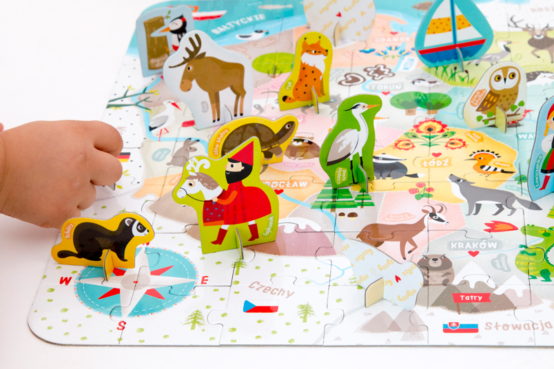 Czuczu Puzzle mapa Polski 49011 Które zwierzęta mieszkają w Morzu Bałtyckim, a które spotkacie w polskich górach? Z czego słynie Toruń? Syrenka to symbol? Ułóżcie Mapę Polski i zobaczcie, jak piękny i interesujący jest nasz kraj! Aby pobudzająca ciekawość i wyobraźnię zabawa trwała jeszcze dłużej do zestawu dołączono 16 figurek. Duża, pełna zabawnych szczegółów układanka zachęci nie tylko czterolatki do wycieczek palcem po mapie i zainspiruje do zdobywania wiedzy o Polsce. Układanie puzzli to pomysł na wspólną zabawę, która rozwija małą motorykę, ćwiczy spostrzegawczość i cierpliwość, a przede wszystkim sprawia mnóstwo radości.