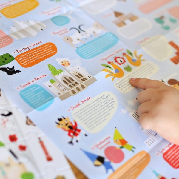Ułóżcie puzzle i sami sprawdźcie, jak wiele miejsc czeka na odkrycie. Bawcie się w wyszukiwanie detali na ilustracji. Opowiadajcie o atrakcjach, legendach, zwierzętach i roślinach. Informacje z plakatu pozwolą wam dowiedzieć się więcej o Polsce i zainspirują do zdobywania nowej wiedzy. Pamiętajcie o sugestiach podczas waszych kolejnych wycieczek! Plakat może stać się oryginalną ozdobą pokoju.