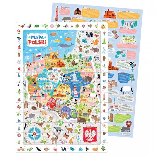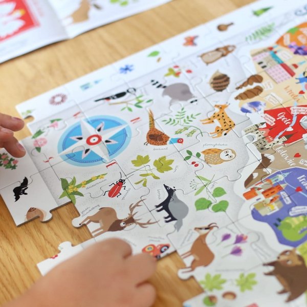117-elementowe puzzle pokazują ciekawe miejsca na mapie kraju i inspirują do poszerzania wiedzy na temat historii, kultury i przyrody. Na ramce układanki umieszczono mnóstwo szczegółów do wyszukania na ilustracji, aby rozwijająca zabawa trwała jeszcze dłużej. Do zestawu dołączono plakat pełen tematycznych ciekawostek.
