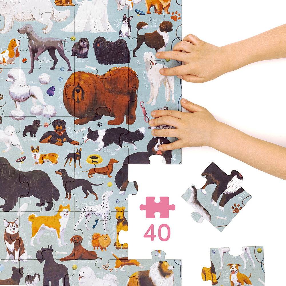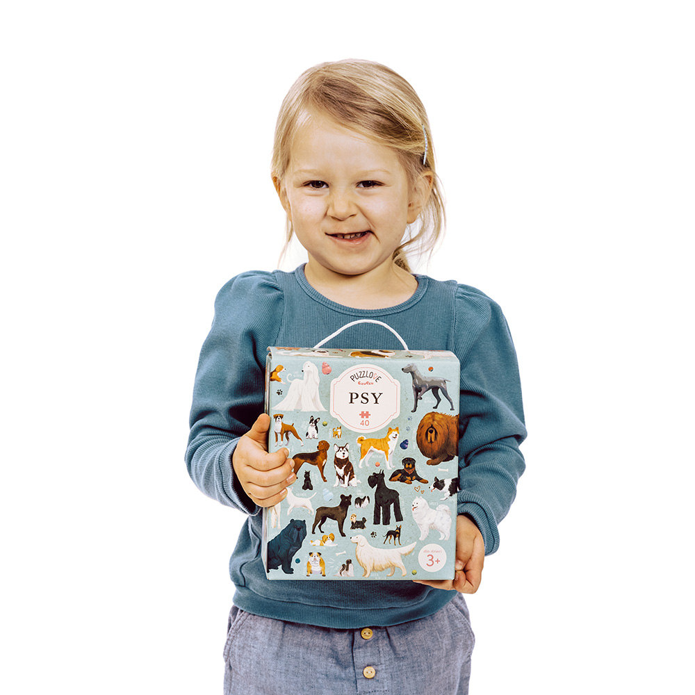 Duże 40-elementowe puzzle przedstawiają wesołe i przyjazne pieski, psy i psiaki, które są gotowe na wspólne psoty i zachęcają do podjęcia poważnego puzzlowego wyzwania. Poznajcie szczekających przyjaciół różnych ras, ćwiczcie spostrzegawczość i cierpliwość, zainspirujcie się do mnóstwa rozwijających aktywności. W CzuCzu wiemy, czym jest radość układania!