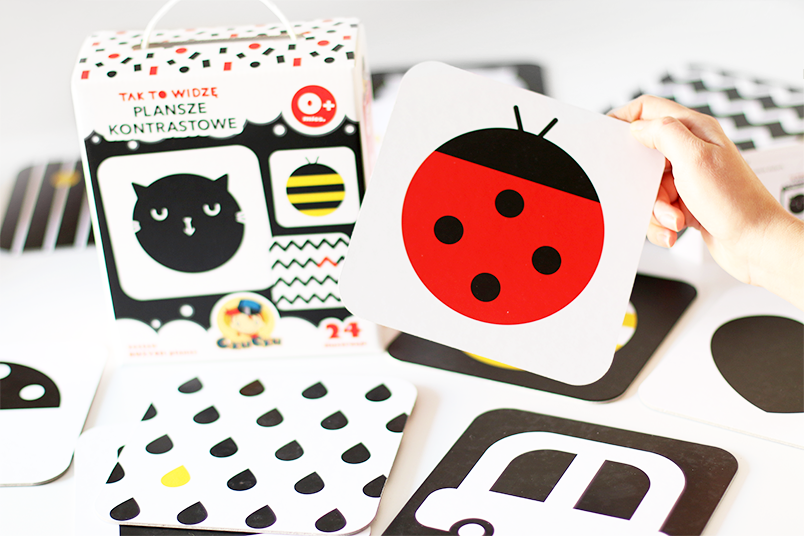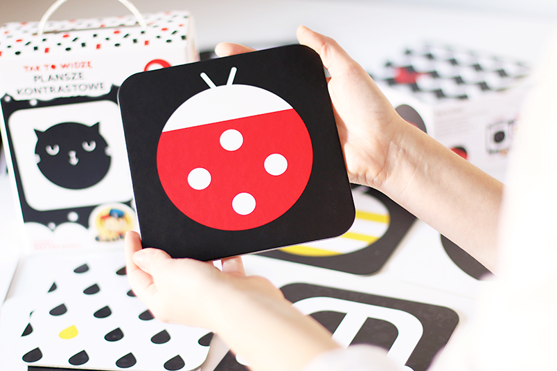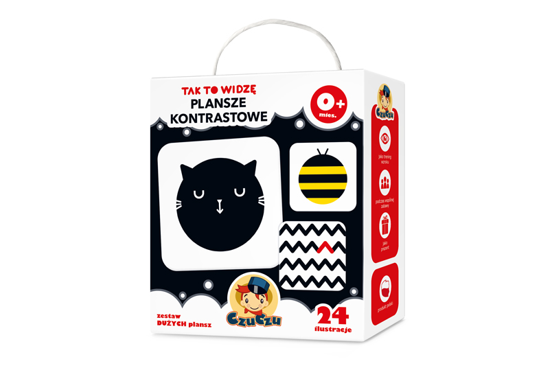 Książeczka obrazkowa składa się z 12 dużych, dwustronnych i trwałych plansz kontrastowych. Została stworzona z myślą o rodzicach, którzy chcą odpowiedzialnie wspomagać swoje maluchy w rozwoju! Kontrastowe ilustracje mają korzystny wpływ na rozwijający się mózg malucha, pomagają niemowlętom kształtować inteligencję wizualno-przestrzenną, poznawać granice przedmiotów, a także ćwiczyć spostrzeganie. Wspólna zabawa z rodzicem buduje więź i bliskość. Zabawę z książeczką można zacząć już od czwartego tygodnia życia dziecka.