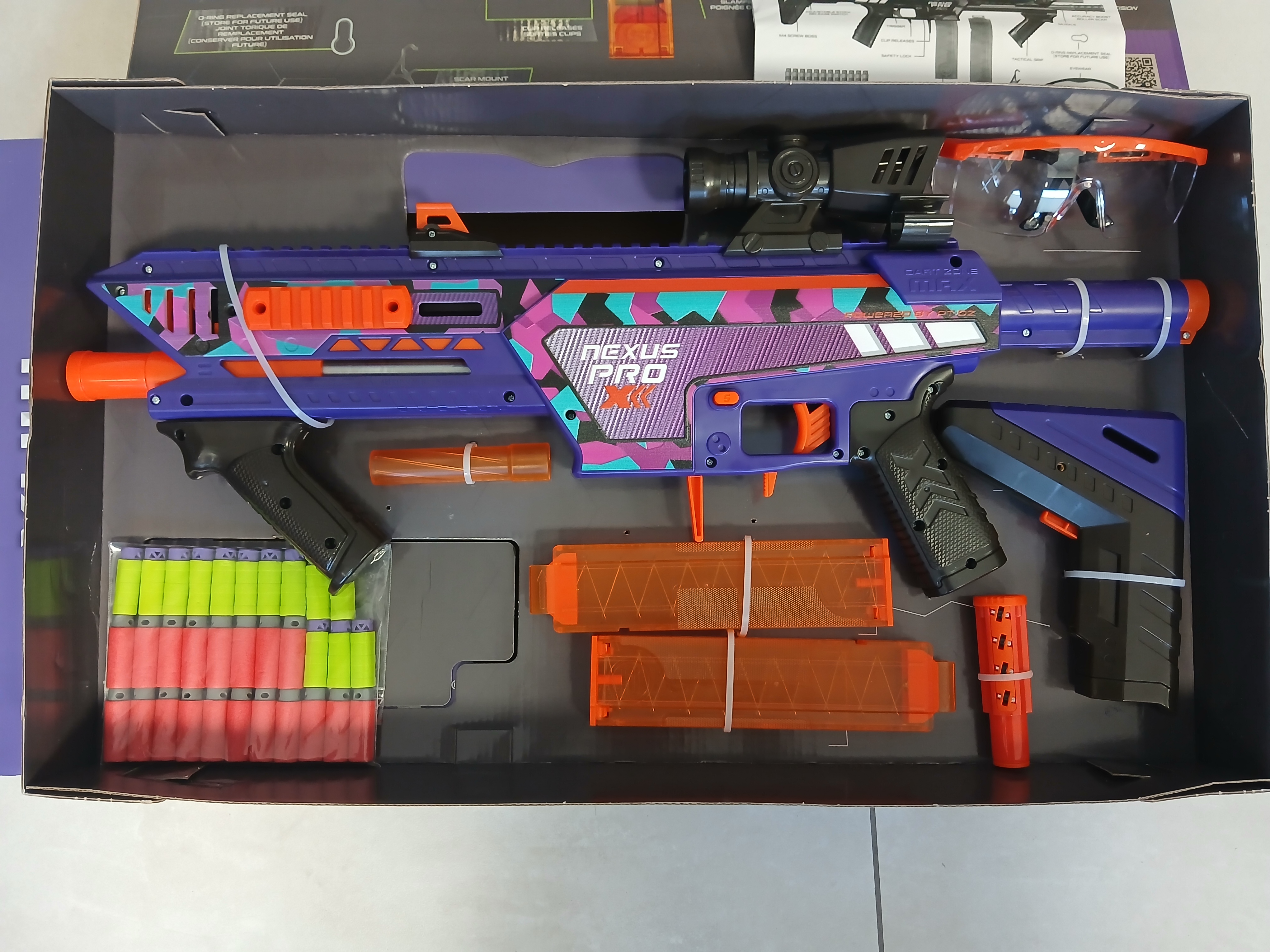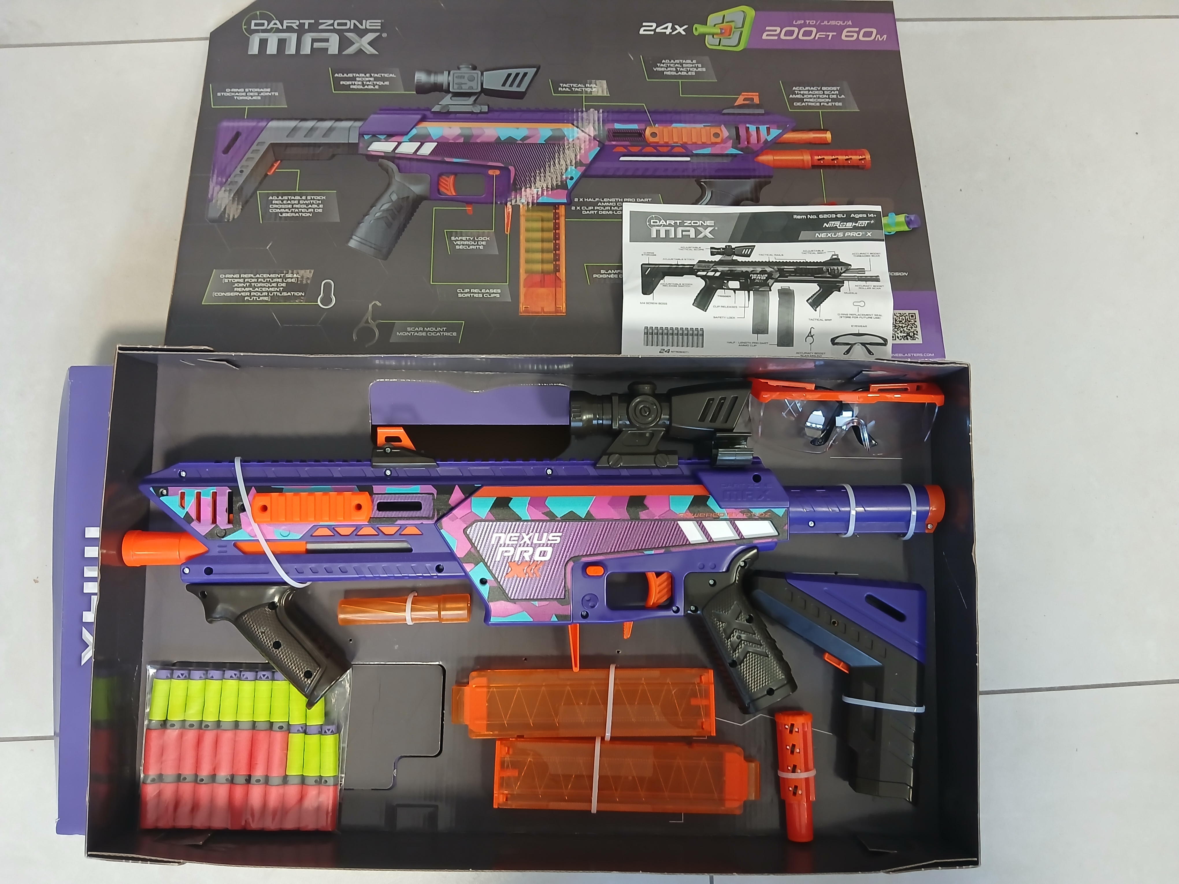 De Dart Zone Max Nexus Pro X to następca oryginalnego modelu Nexus Pro. Nexus Pro X zapewnia moc i wydajność zaraz po wyjęciu z pudełka. Ten blaster strzela tylko krótkimi strzałkami z wydajnością do 200 FPS. Blaster ma regulowaną kolbę. Kolba ma mały schowek, który pozwala na przechowywanie małych przedmiotów, takich jak dołączona zapasowa uszczelka o-ring. Dzięki szybkostrzelności, magazynek Nexus Pro X opróżnia się bardzo szybko. Nexus Pro X jest wyposażony w dwie lufy PCAR z plastikowymi rolkami zwiększającymi celność i pomagają dostosować strzelanie do własnych potrzeb. Aktywuj szybką akcję Slamfire, przytrzymując spust i stale odciągając suwak przeładowywania.