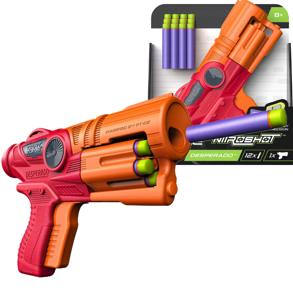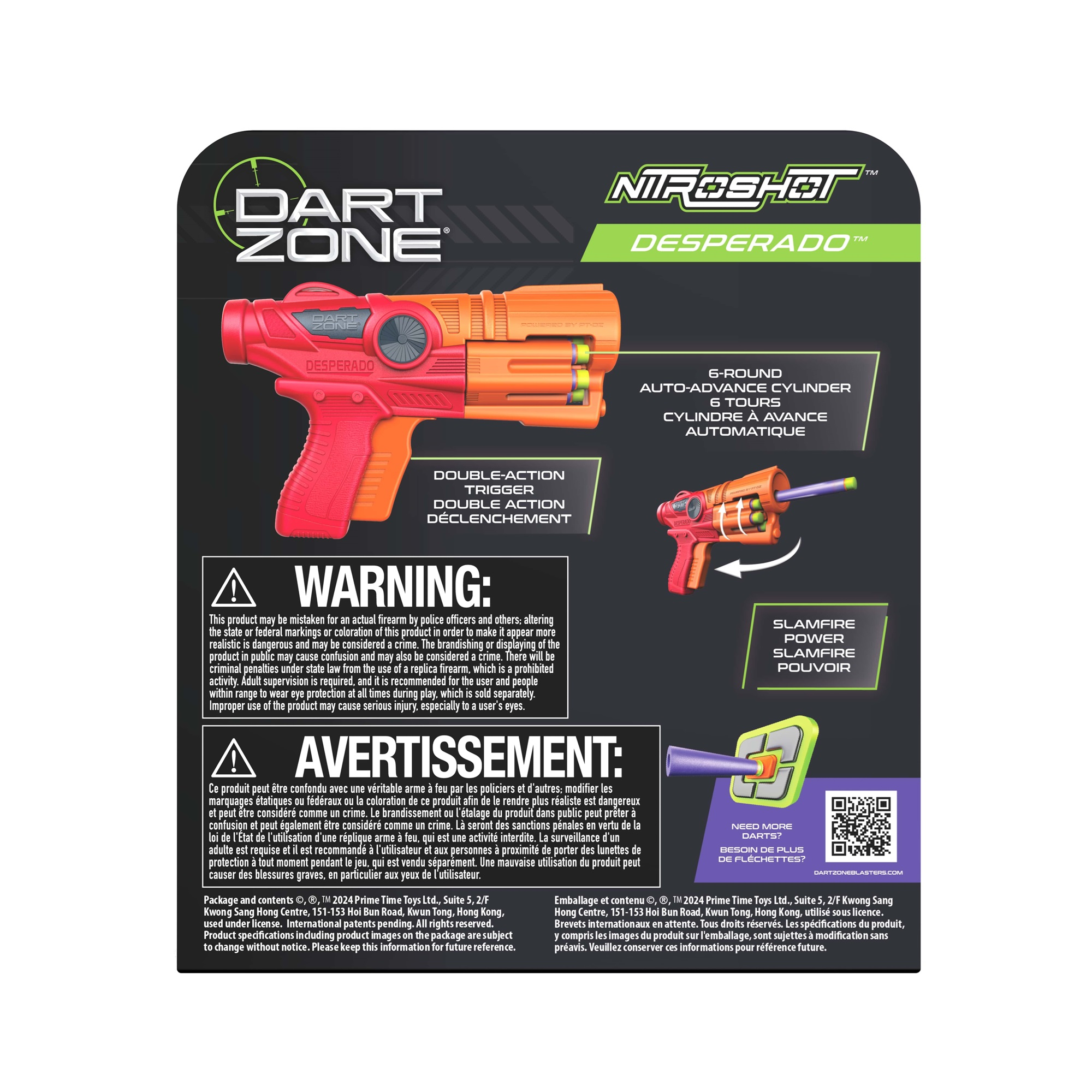Kompaktowy i stworzony do akcji, Dart Zone Nitroshot Desperado to dynamiczna wyrzutnia wyposażona w spust o podwójnym działaniu. Pistolet posiada obrotowy magazynek o pojemności 6 strzałek. Jego elegancka konstrukcja została zaprojektowana z myślą o łatwej obsłudze, dzięki czemu jest ulubionym wyborem zarówno entuzjastów jak i nowicjuszy. W zestawie znajduje się 12 strzałek Nitroshot, które zapewniają wystarczającą rezerwę w intensywnych momentach.