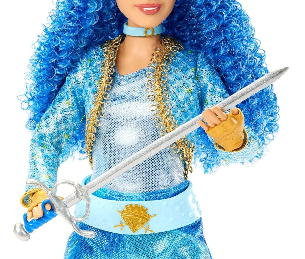 Chole Charming to główna bohaterka najnowszego serialu dla dziewczynek Disney, „Descendants 4: The Rise of Red”! Ta fascynująca lalka charakteryzuje się ruchomymi nogami, rękami oraz głową, co sprawia, że jej odwzorowanie jest niezwykle precyzyjne. Ubrana zgodnie z najnowszymi trendami, prezentuje się w błyszczącym, niebieskim topie, spodniach, kurtce oraz stylowym pasku, co czyni ją prawdziwą ikoną mody. Całość jej outfitu dopełnia burza niebieskich loków o silnym skręcie. Chole Charming trzyma w ręku miecz, ponieważ zawsze jest gotowa walczyć o to, co słuszne!