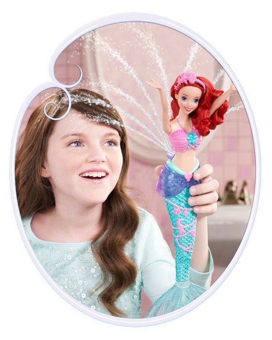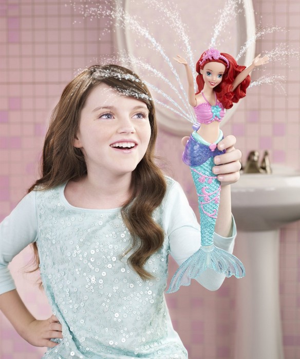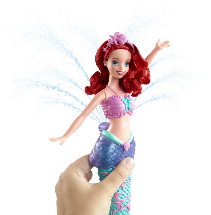 Odtwarzaj niezapomniane sceny z filmu! Po naciśnięciu przycisku na plecach Arielka wystrzeli w górę fontanną wody. To prawdziwy wodny show!