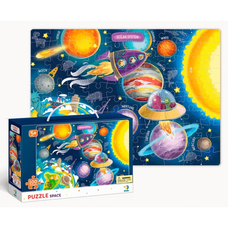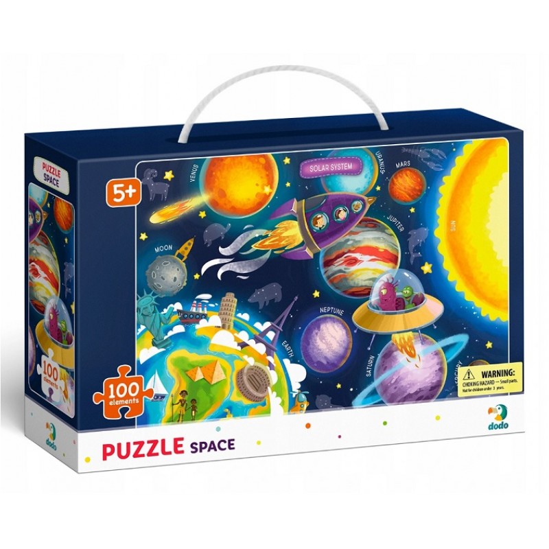 Puzzle DODO Kosmos to zestaw przeznaczony dla maluchów zafascynowanych podróżami między planetami Układu Słonecznego. Gotowa ilustracja przedstawia dzieci odbywające podróż fioletową rakietą, które przez niewielkie, okrągłe okienka mogą bacznie obserwować planety, księżyc, gwiazdy, a nawet słońce! Puzzle w zabawny i przystępny sposób pokazują maluchom, w jaki sposób skonstruowany jest wszechświat i jakie są jego elementy składowe.