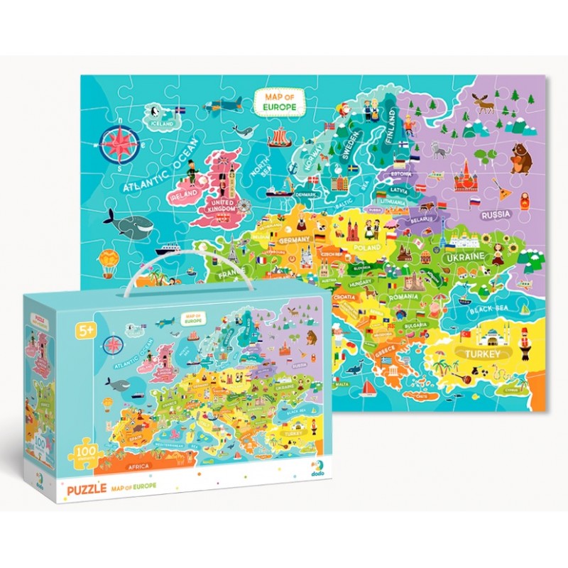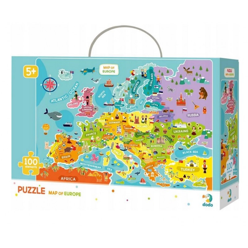 Mapa Europy z serii DODO to zestaw składający się ze 100 puzzli, które po ułożeniu tworzą obrazek o wymiarach 64 cm x 46 cm. Gotowy obrazek przedstawia Europę z podziałem na poszczególne państwa – każdy kraj został podpisany i oznaczony innym kolorem. Dodatkowo, na powierzchni każdego państwa widnieją zabawne obrazki, które wskazują na specyfikę danego miejsca. Tym sposobem maluchy mogą się dowiedzieć, że we Włoszech serwuje się najlepszą pizzę, że we Francji znajduje się Wieża Eiffla oraz że Rosja to kraj o zdecydowanie największej powierzchni. Nauka poprzez zabawę to dewiza serii DODO!