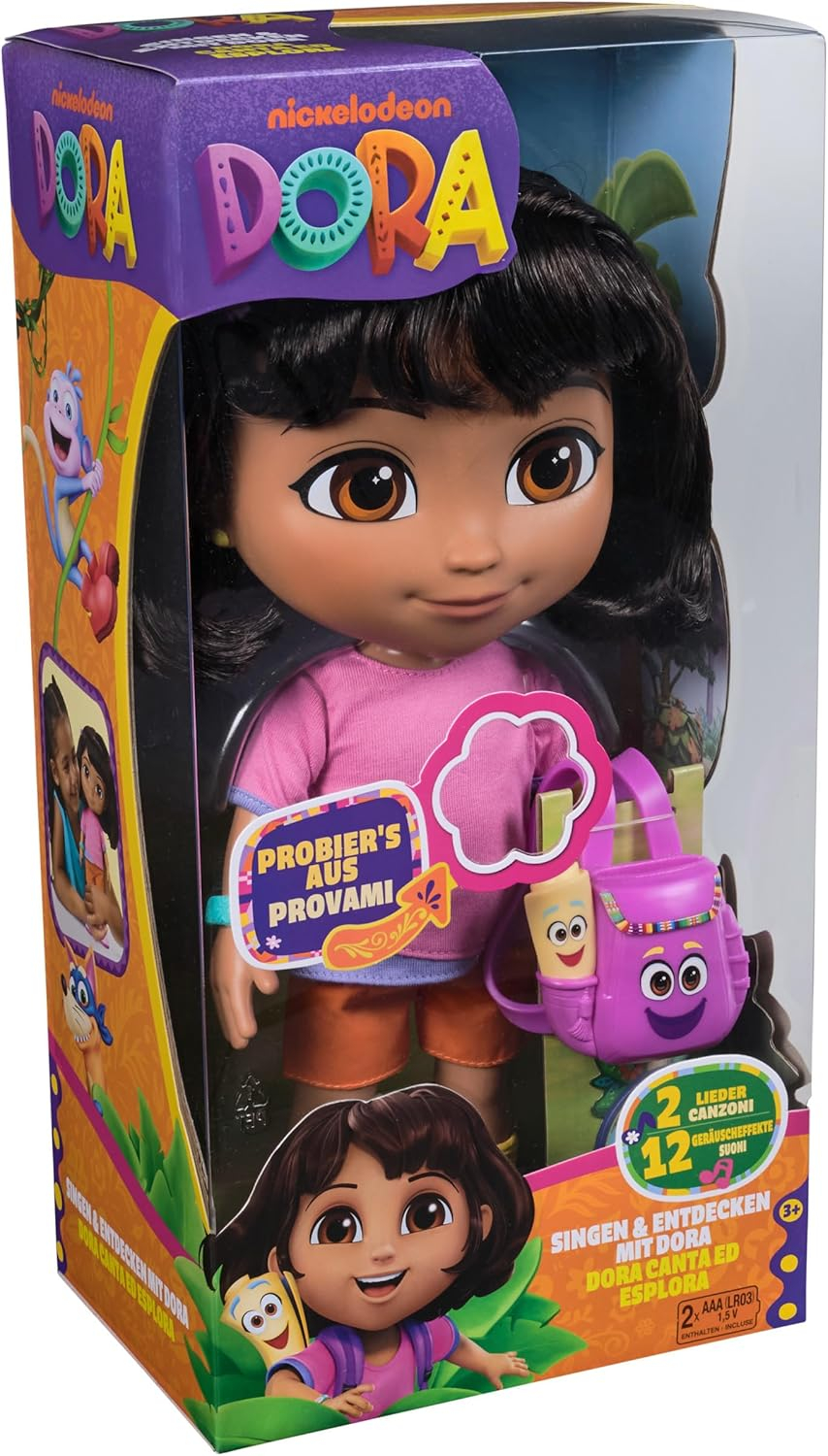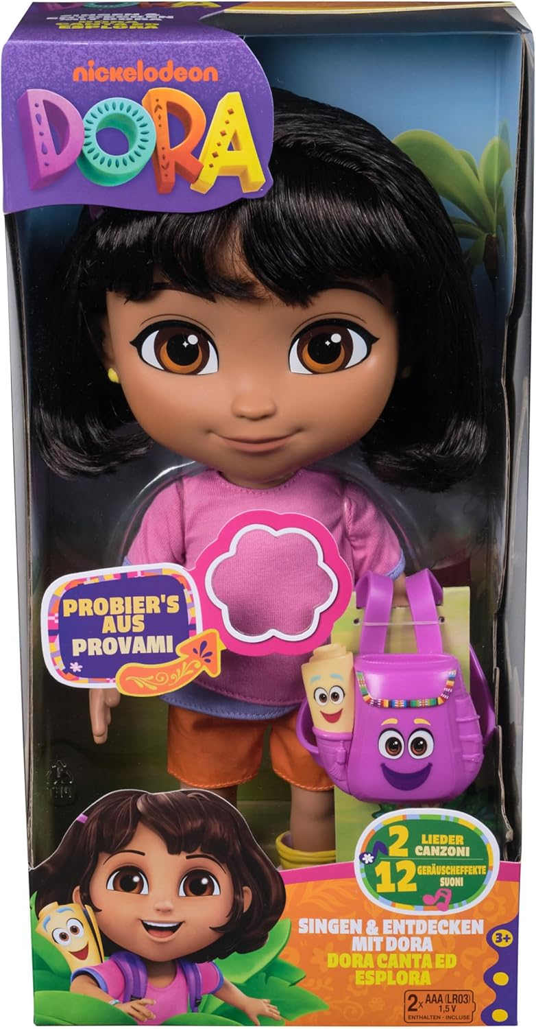 Teraz możesz je pogłębiać i rozszerzać dzięki lalce Sing with Me Dora, która mówi po niemiecku i angielsku lub po włosku i angielsku. Dzięki dwóm piosenkom i ponad 25 zwrotom i dźwiękom dzieci mogą zanurzyć się w (językowym) świecie swojej bohaterki i ożywić go poprzez interakcję!