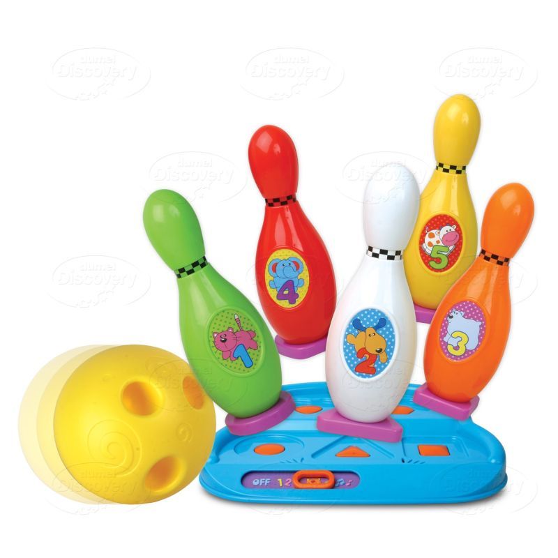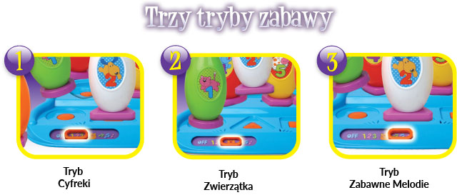 Kiedy dziecko odgadnie prawidłowy kształt i umieści kręgle w odpowiednim miejscu podstawy usłyszy, w zależności od wybranej funkcji: cyfry, nazwę zwierzątka, jego charakterystyczny dźwięk oraz zabawne melodie. Oprócz nauki produkt zapewni Dziecku mnóstwo zabawy w zbijanie kręgli.