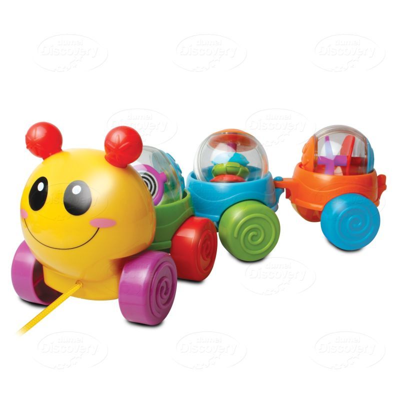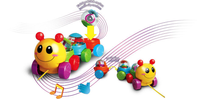 Sympatyczna gąsienica na sznureczku z obracającymi się i grzechoczącymi kuleczkami. Gąsienica na sznureczku do prowadzenia przez Maluszka. Pociągnij gąsienicę Gosię za sznureczek i obserwuj jak kuleczki zaczną się wesoło obracać wydając grzechoczące dźwięki. Gąsienica składa się z osobnych elementów, które w łatwy sposób można rozłączyć i połączyć za pomocą plastikowych zaczepów. Przekręcając czułki gąsienicy Gosi usłyszymy zabawny terkoczący dźwięk. Dodatkową atrakcją są kuleczki, które mogą służyć jako odrębna zabawka.