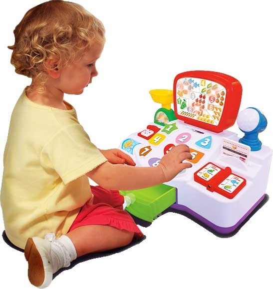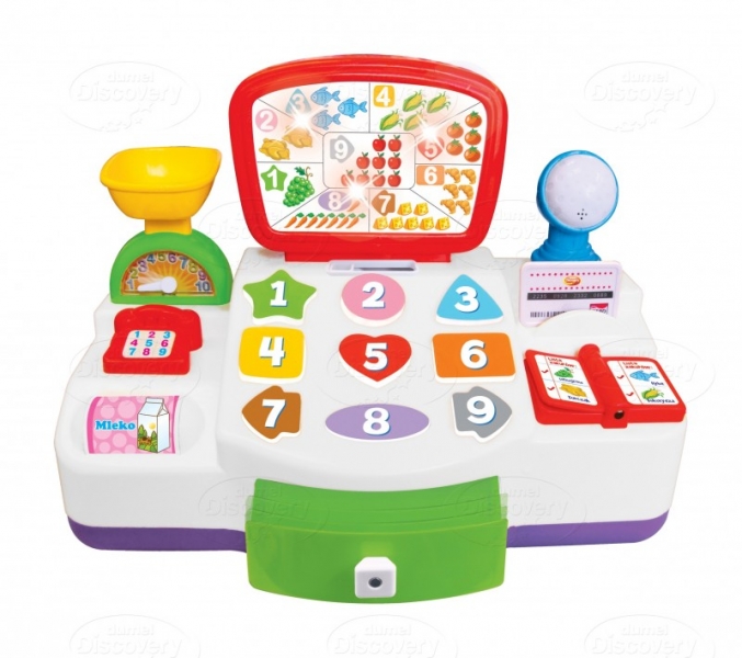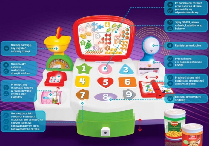 Kasa sklepowa do nauki kolorów, kształtów oraz cyferek połączonej z zabawą sprawi niejednemu maluszkowi wiele radości. Naciskając różne cyferki oraz telefonik, ważąc produkty na wadze, przekładając kartkę mini-książeczki, dziecko usłyszy zabawne dźwięki oraz melodie. Na ekraniku podświetlają się różne obrazki, które uczą dzieci rozpoznawania cyferek oraz liczenia.