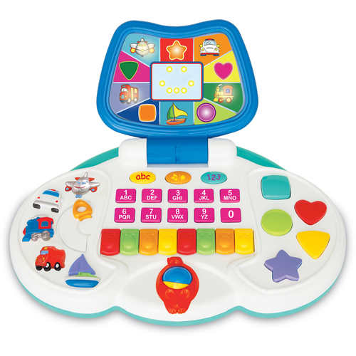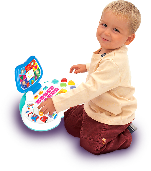 Mój Pierwszy Laptop to interaktywna zabawka, ucząca kształtów i kolorów. Przesuwając strzałkę można usłyszeć 5 różnych dźwięków pojazdów lub naciskać przyciski o różnych kształtach i kolorach, aby zobaczyć odpowiadający im kształt w monitorze. Umieszczono przełącznik i guziczki do nauki liter oraz cyfr. Dzięki mini klawiaturze umieszczonej w laptopie dzieci uczą się gry na pianinie. Poruszając kółkiem w małej myszce rozpoczyna się grę lub test ze znajomości wszystkich dźwięków, kolorów, liter i cyfr mieszczących się w laptopie. Zabawka w angielskiej wersji językowej.
