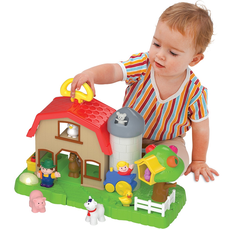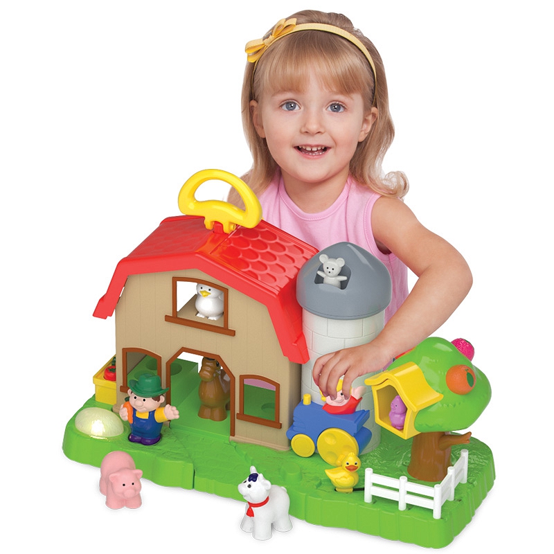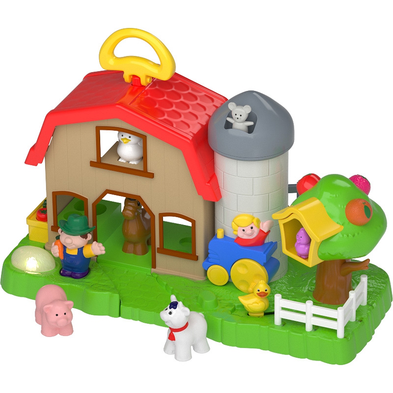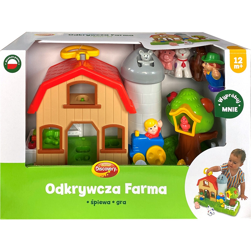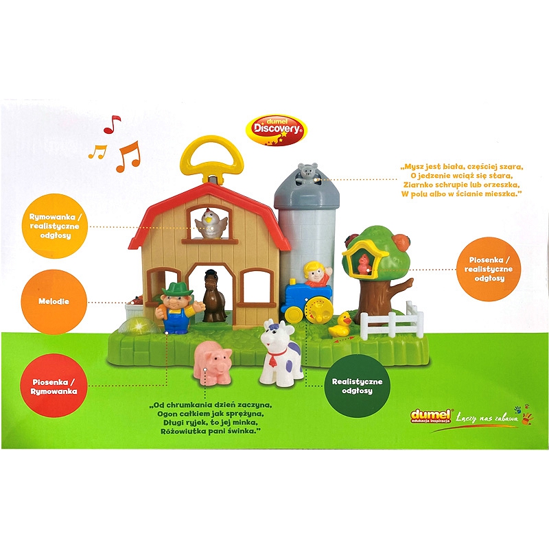 Odkryj wspaniałe urokliwe wiejskie życia z Kolorową Odkrywczą Farmą, na której dni płyną spokojnie, przy dźwiękach słodkich melodii. Mieszka tu farmer wraz ze swymi zwierzątkami, a wszystkich małych gości, którzy zechcą ich odwiedzić, ugoszczą mnóstwem atrakcji! Dzieci znajdą tu sorter kształtów, rymowanki, piosenki w języku polskim, melodie, a nawet realistyczne odgłosy zwierzaków. Frama posiada na dachu wygodny uchwyt, który ułatwi przenoszenie jej w wybrane miejsce. Zawiera rymowanki w języku polskim!
