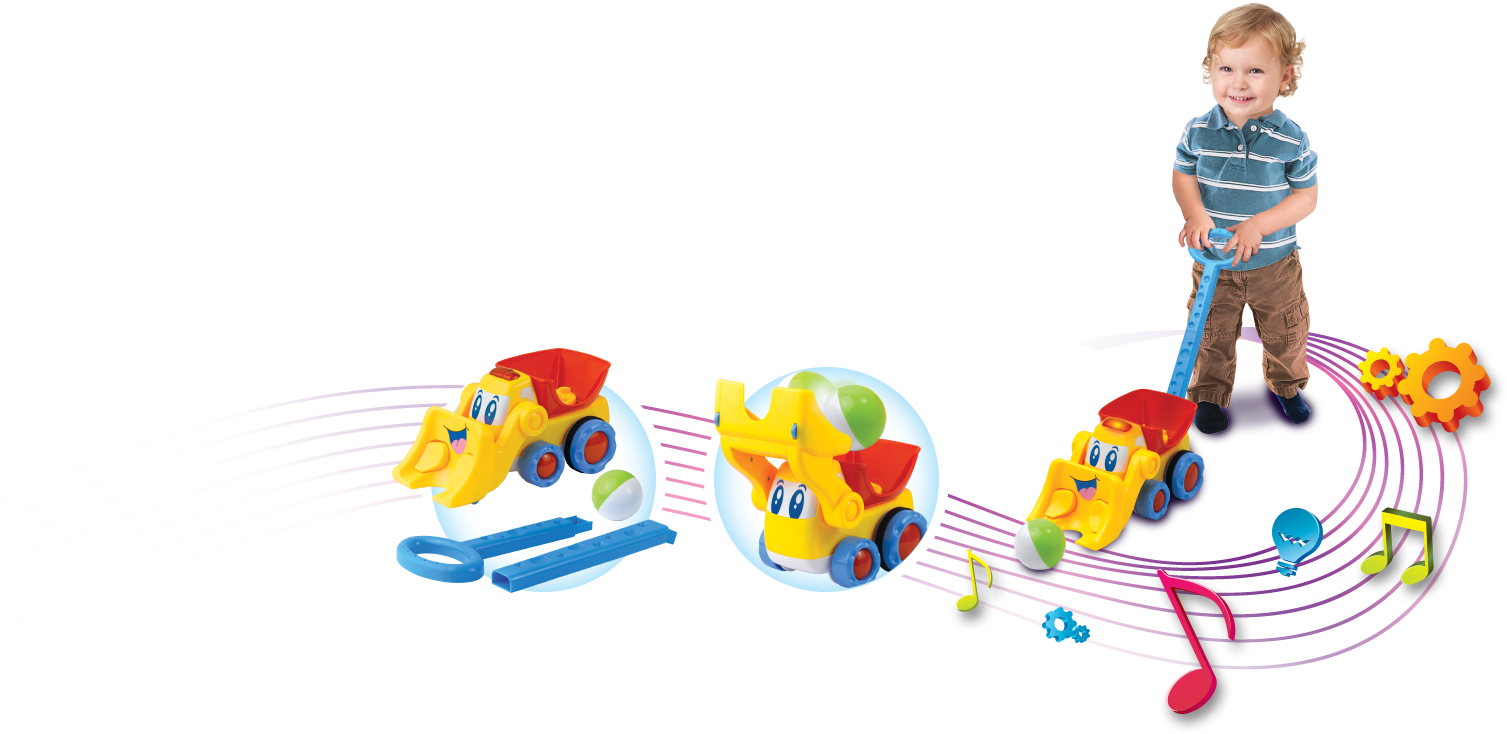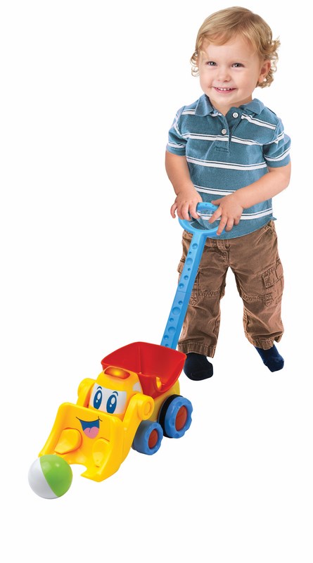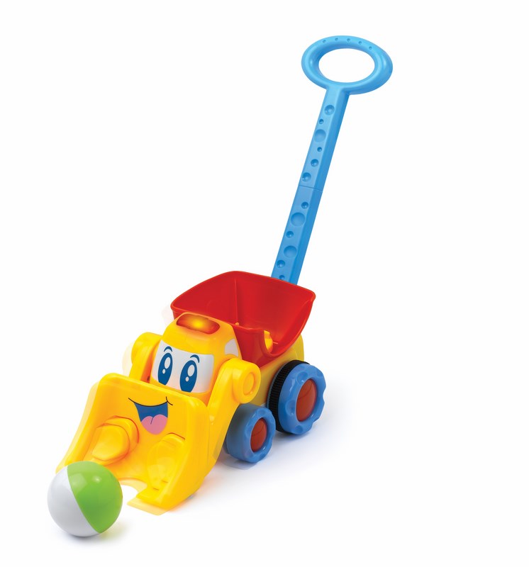 Buldożer, który zbiera piłeczki i wrzuca je na przyczepkę. Posiada wygodną rączkę do prowadzenia. Nie jest to zwykły pchacz. Naciśnij na światełka pojazdu, aby uruchomić światełka i zacznij zabawę. Piłeczka znajdująca się na przyczepce zacznie wesoło się kręcić, aby z niej wyskoczyć. Buldożer tylko na to czeka. Maluszek podjeżdża pojazdem najeżdżając łyżką, która jest ruchoma, na piłkę, aby w „magiczny” sposób z powrotem przerzucić ją na przyczepkę przy dźwiękach zabawnych melodii.