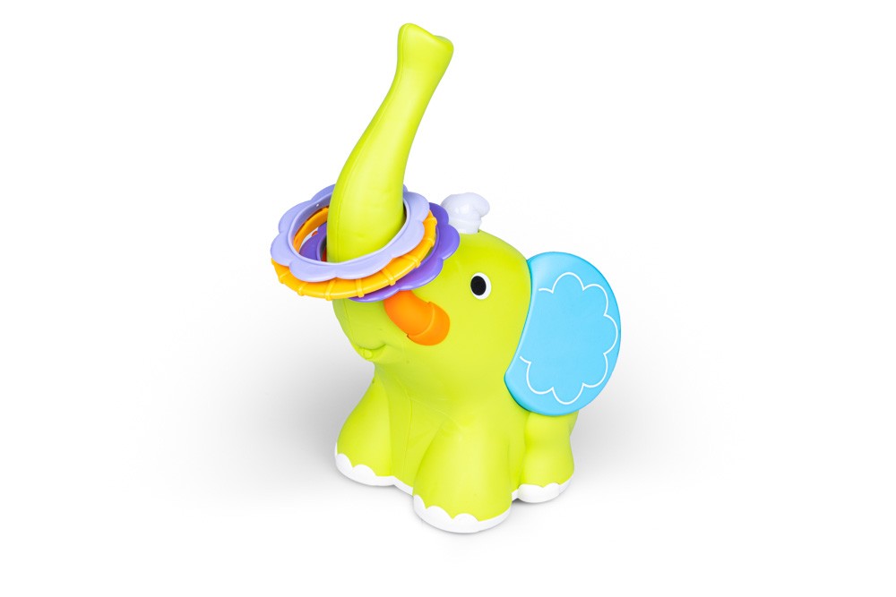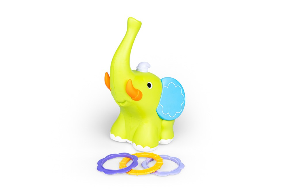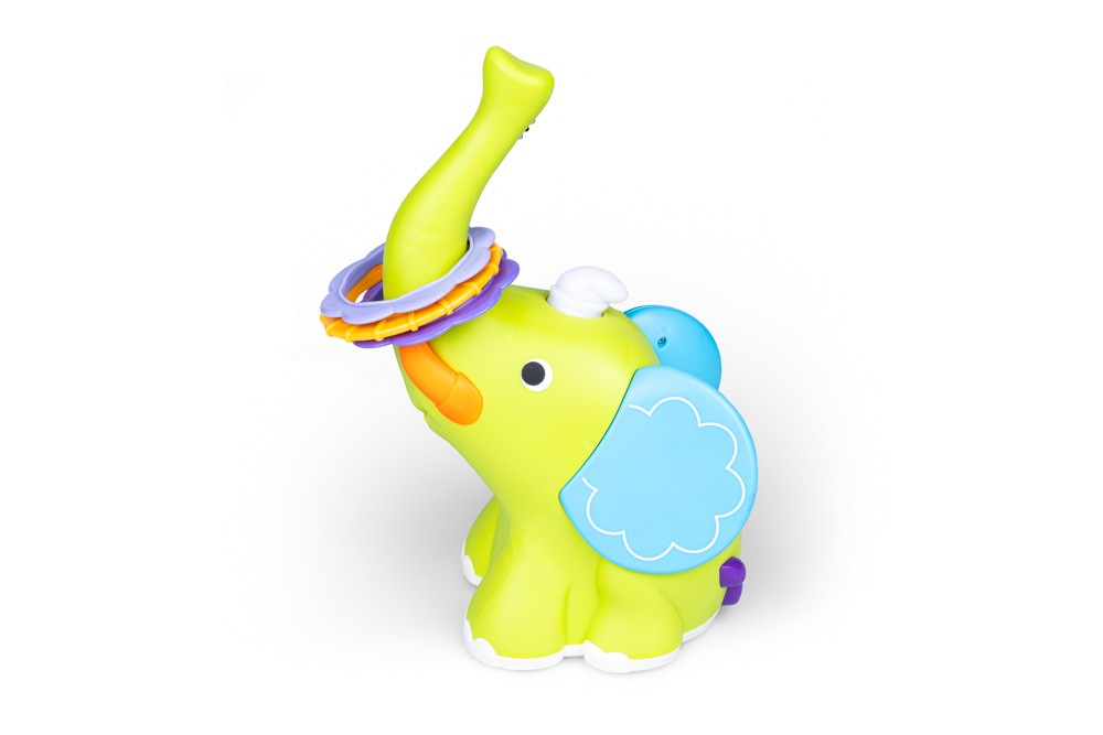 Razem ze Słonikiem ćwicz celność i przekonaj się czy jesteś zwinniejszy od niego! Zabawa polega na wrzuceniu wprost na słoniową trąbę kolorowych obręczy, które znajdują się w zestawie. Żeby nie było tak łatwo, cel jest ruchomy, gdyż słonik przemieszcza się, jeżdżąc we wszystkich kierunkach. Naciśnij na czapeczkę słonika, słuchaj piosenki w języku polskim i… trenuj rzuty!