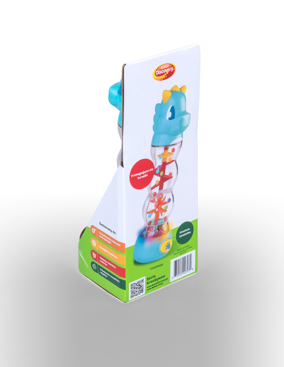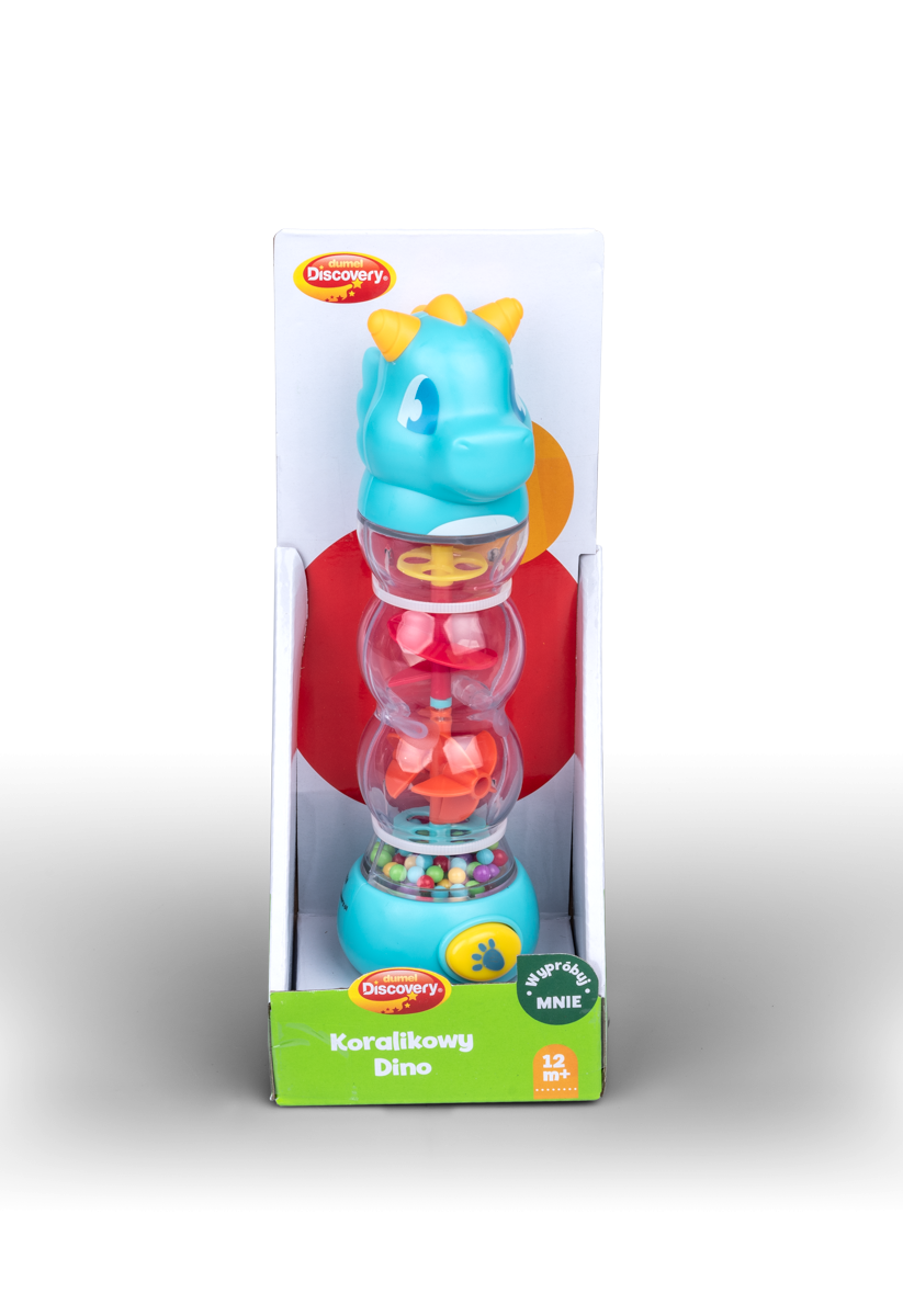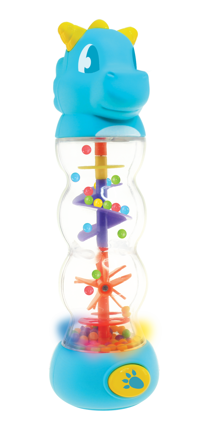 Dźwięk deszczu w zasięgu rączki Twojego Malucha! Tez zabawny dinozaur, kryje w swym brzuszku kolorowe koraliki, które przy potrząsaniu zabawką wesoło grzechoczą. Umieszczony w podstawie guziczek uruchamia kolorowe światełka, które uatrakcyjnią zabawę.
