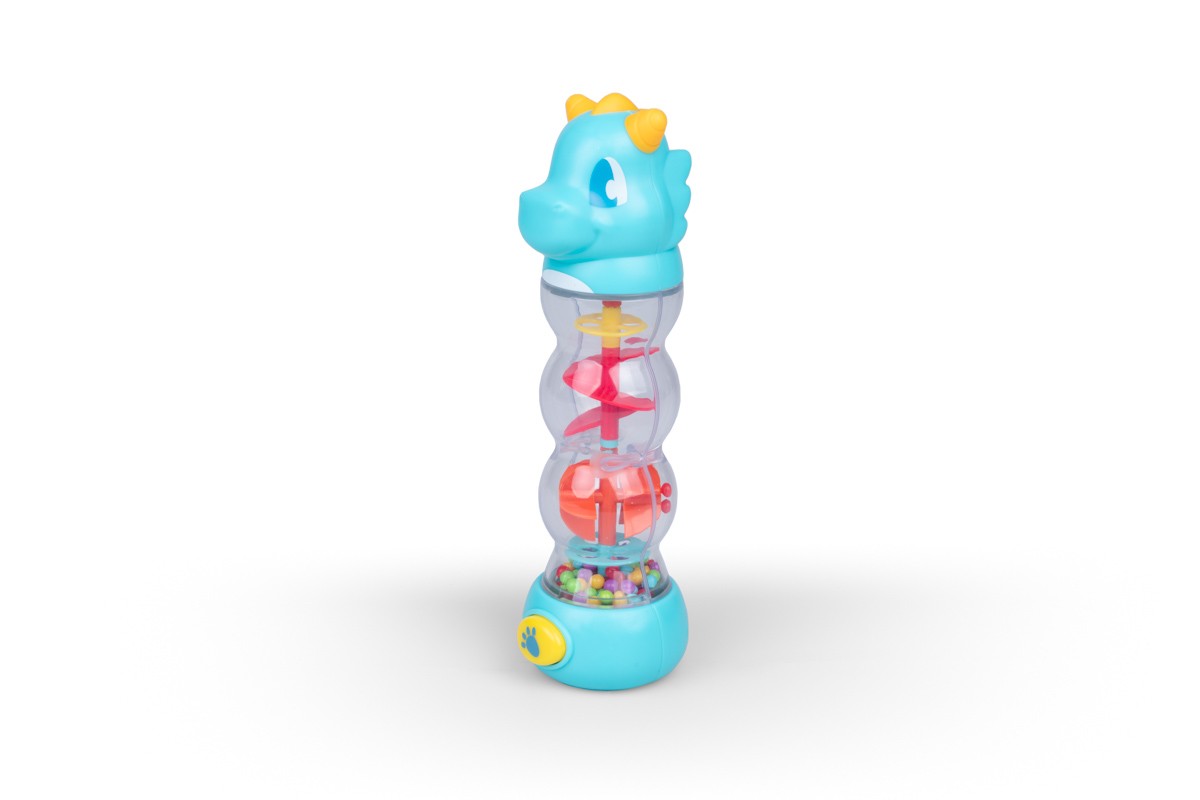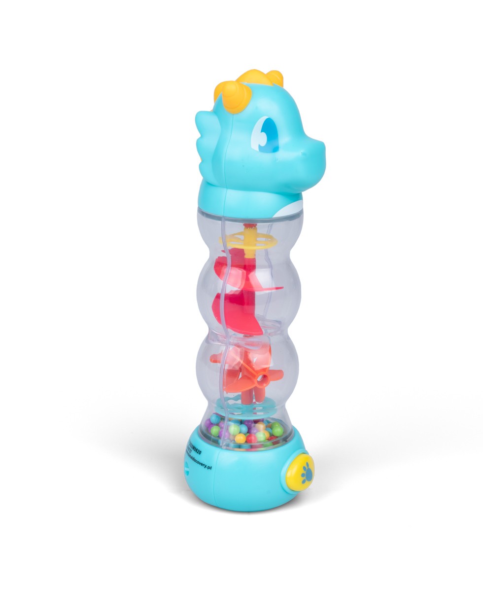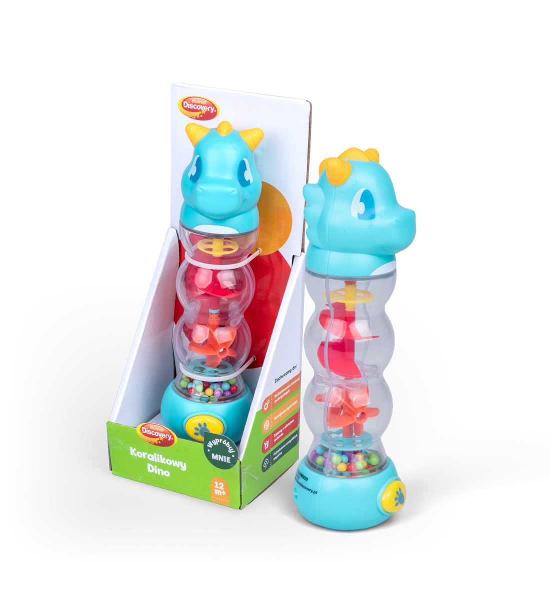 Dźwięk deszczu w zasięgu rączki Twojego Malucha! Tez zabawny dinozaur, kryje w swym brzuszku kolorowe koraliki, które przy potrząsaniu zabawką wesoło grzechoczą. Umieszczony w podstawie guziczek uruchamia kolorowe światełka, które uatrakcyjnią zabawę.