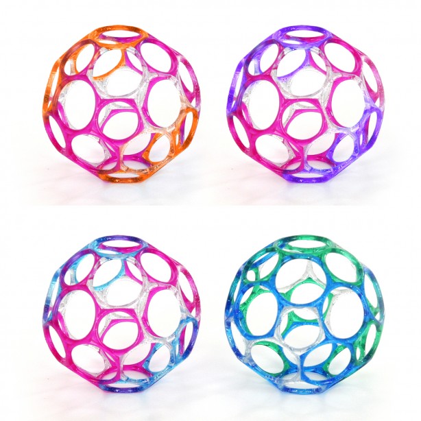 Łatwy do zgniatania, rzucania, chwytania, gryzienia oraz kopania. Produkty Oball kształtują i wspomagają rozwój motoryki, koordynacji ruchowej w szczególności ułatwiają naukę chwytania. Tworzywo, z którego zabawka została wykonana jest odpornego na odkształcania, posiada wyjątkową konstrukcję, gładką strukturę, różnoraką kolorystykę oraz duże otwory dzięki czemu jest łatwa do zgniatania, rzucania, chwytania, kopania oraz gryzienia. Wszystkie te cechy zachęcają dzieci do zabawy. Ponieważ produkt pozbawiony jest PCV, lateksu, ftalanów, bis fenolu A (BPA) jest bezpiecznym gryzakiem lub grzechotka dla dzieci najmłodszych a nawet niemowlaków.
