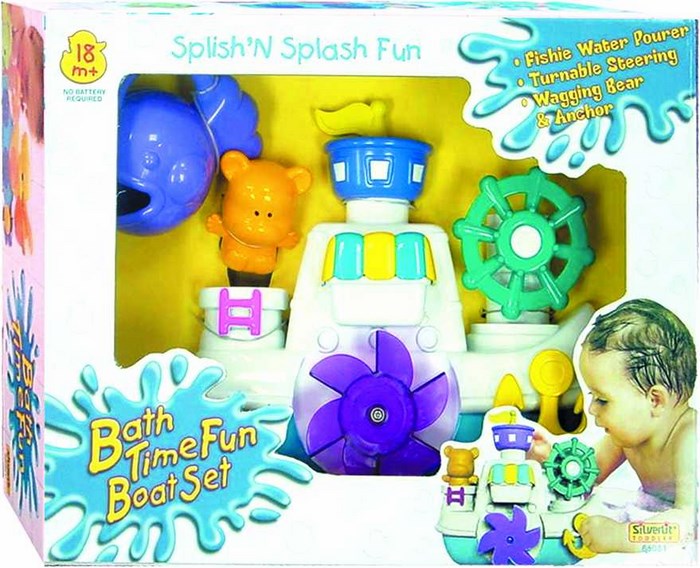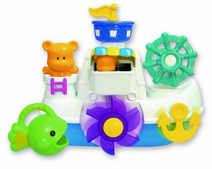 Kolorowe zabawki do wody. Dziecko z pewnością zajmie się zabawą w wodzie co zachęci je do kąpieli. Zabawka rozwija zdolności motoryczne dziecka i pomaga w nauce ustalania związków przyczynowo-skutkowych. Statek posiada przyssawki, które można przyczepić do płytek albo do wanny.