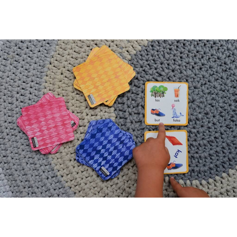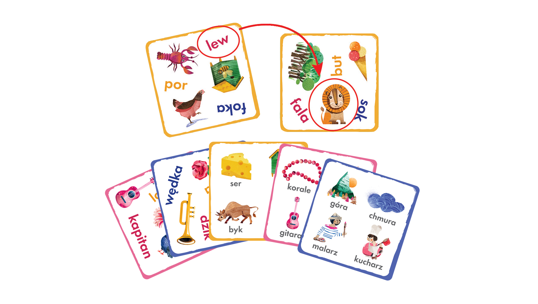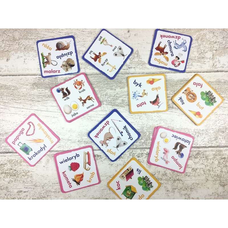 Na kartach do gry ilustrowanych przez Joannę Gwis, pojawiły się kolorowe przedmioty znane z życia codziennego, zwierzęta oraz odpowiadające im nazwy. Barwne grafiki dodają rozgrywkom atrakcyjności, przyciągają uwagę dziecka i skupiają jego wzrok podczas gry. W zestawie są również dodatkowe karty z minisłowniczkiem obrazkowym, idealnym dla sprawdzenia wiedzy i powtórek.