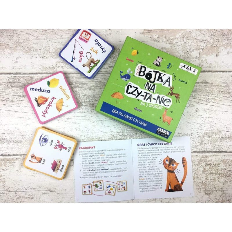 Bójka na czytanie bazuje na metodzie sylabowania, dzięki której dziecko doskonali swoje umiejętności z każdą rozgrywką. Zależnie od poziomu zaawansowania, gracze wybierają do gry karty o jednym z trzech poziomów trudności: najłatwiejszy, z wyrazami 1- i 2-sylabowymi, z sylabami otwartymi; średni, z wyrazami 2-sylabowymi z sylabą zamkniętą i 3-sylabowymi oraz najtrudniejszy, z polskimi znakami diakrytycznymi i głoskami. Zabawa z Bójką na czytanie to także trening logicznego myślenia, koncentracji, spostrzegawczości. Do gry można zaangażować nie tylko rodzeństwo i rówieśników, ale również całą rodzinę!