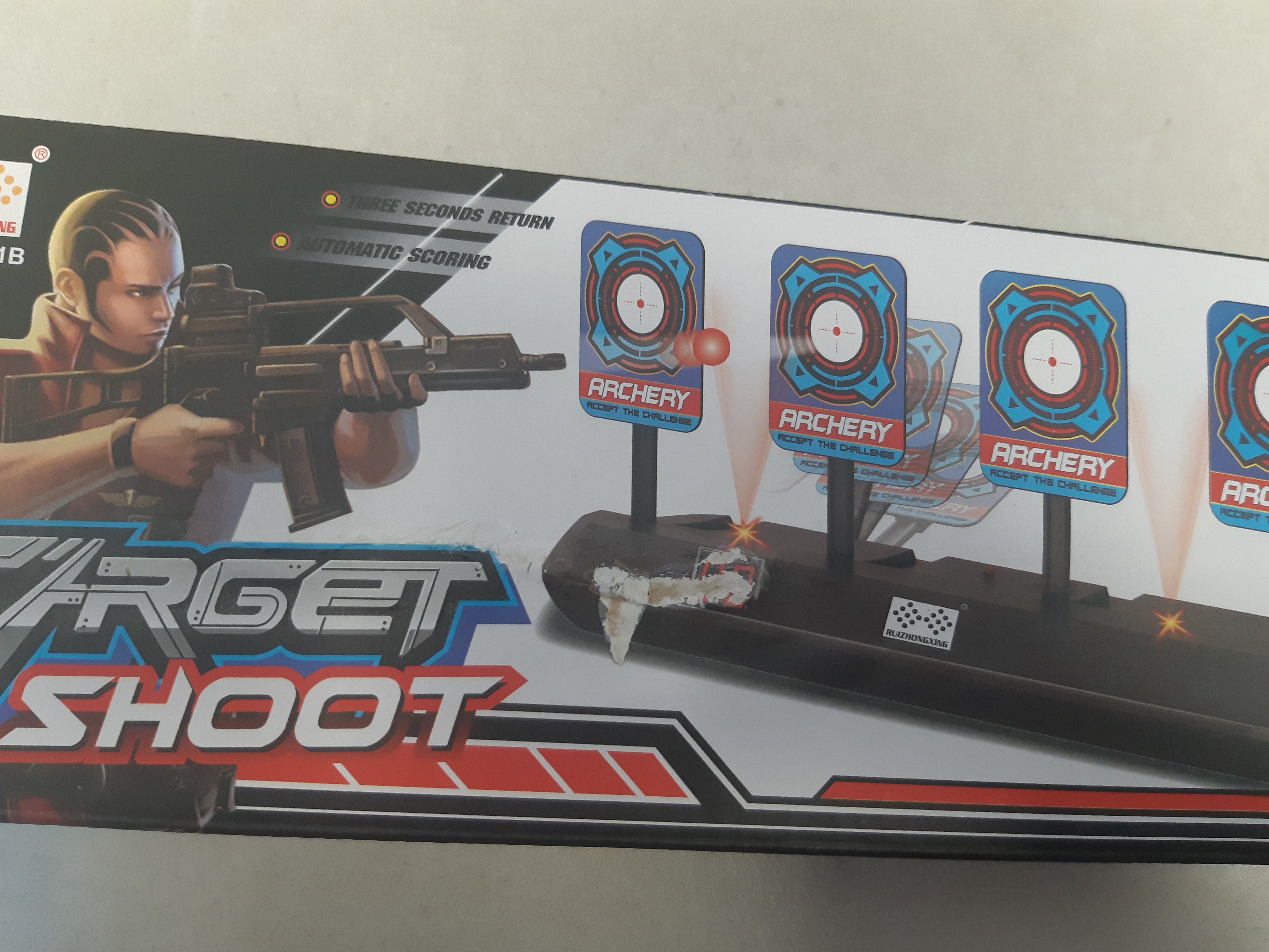 Tarcza składa się z podstawki i trzech ruchomych celów. Na podstawce znajduje się podwójny cyfrowy ekran wyników, głośnik oraz włącznik. Każdy cel, po trafieniu, kładzie się do tyłu. Po zestrzeleniu trzech celi uzyskujemy jeden punkt i wszystkie cele automatycznie podnoszą się do góry. Teraz możemy kontynuować zabawę. Tarcza posiada efekty świetlne i dźwiękowe. Po trafieniu do celu możemy usłyszeć dźwięk tłuczonego szkła, czy też gromkie oklaski.