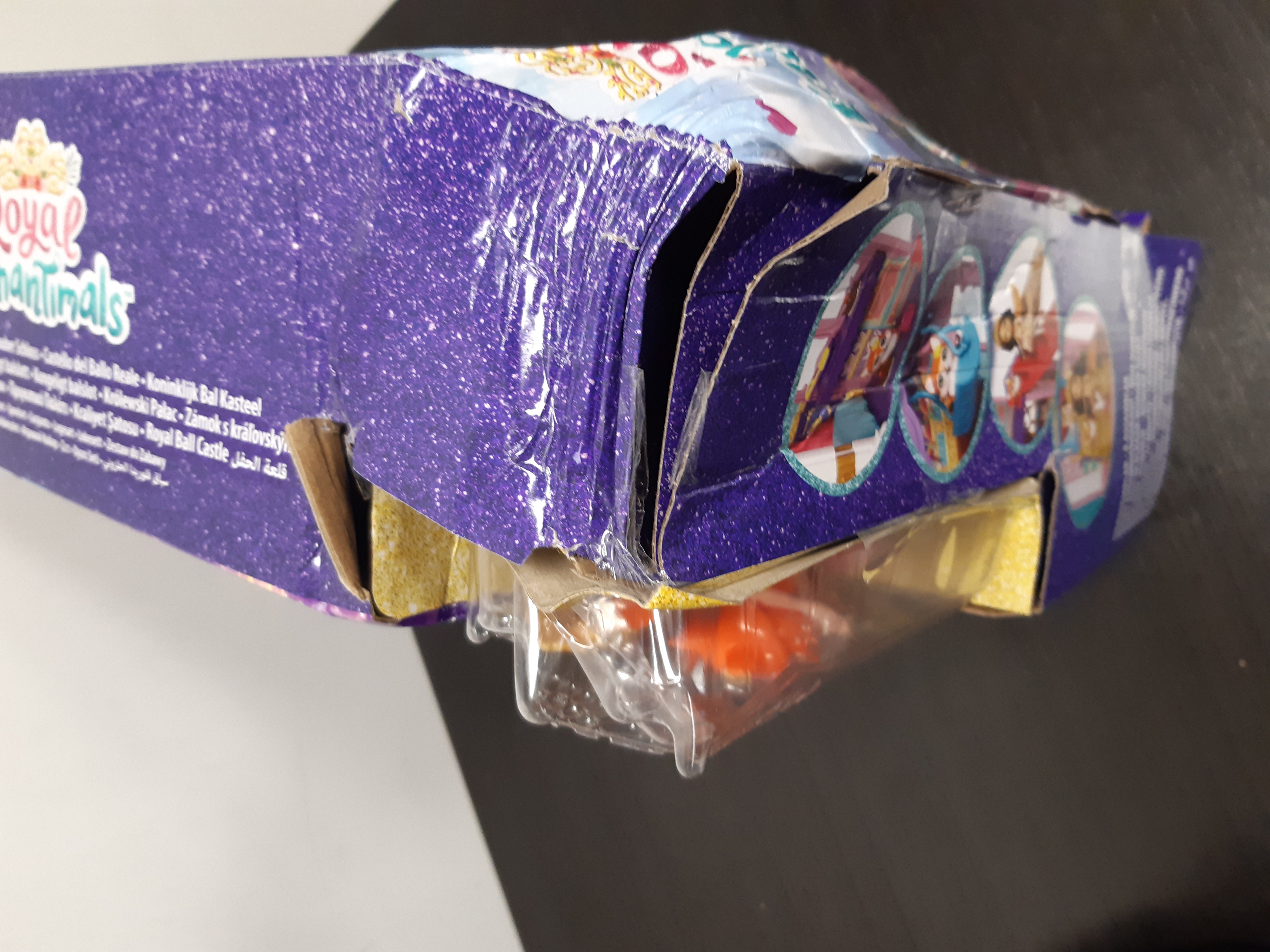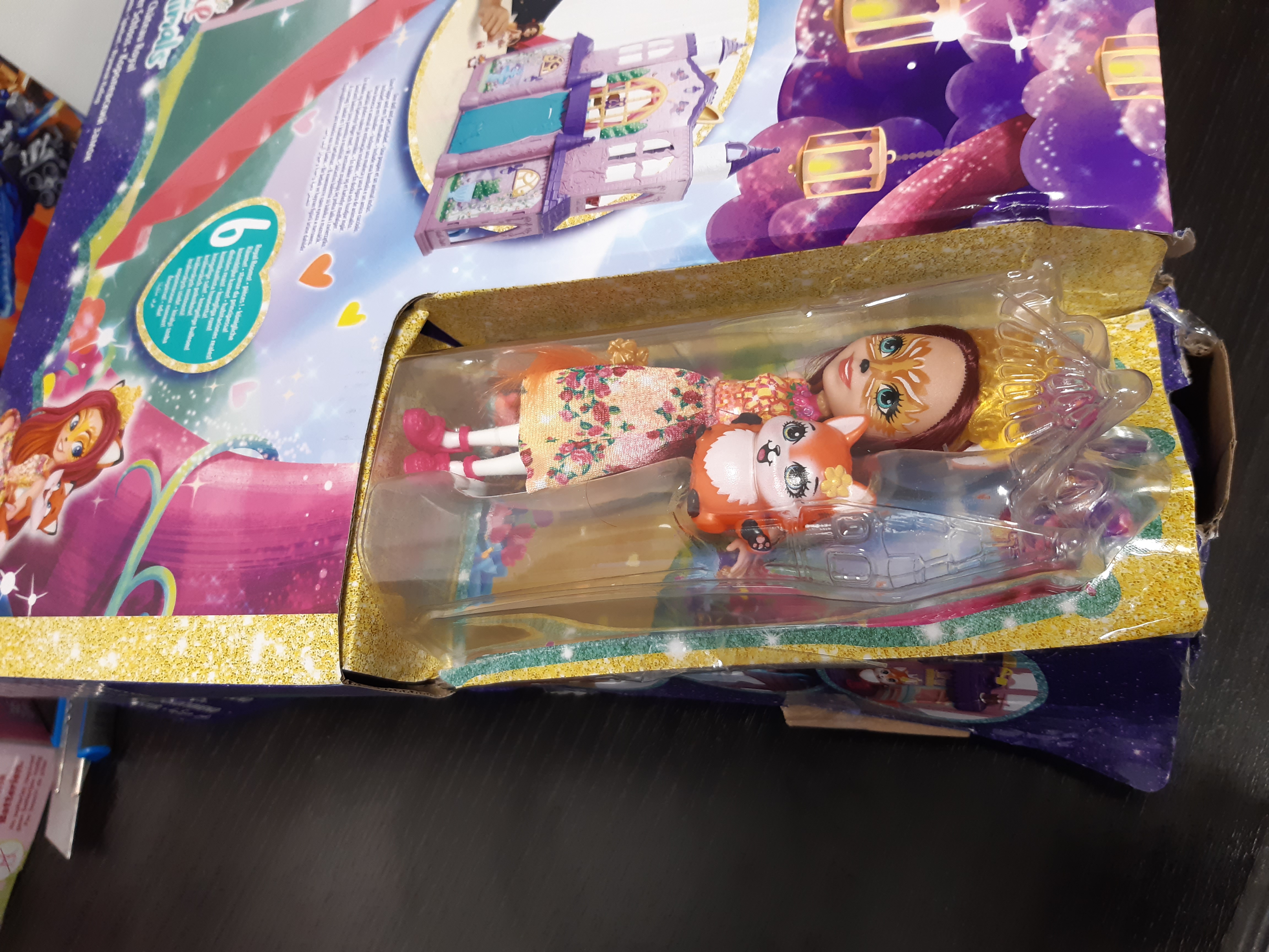 Uwaga! Produkt posiada mocno uszkodzone opakowanie zewnętrze. Uszkodzenie pokazane jest na ostatnich zdjęciach. Lalka i elementy pałacu są całe.