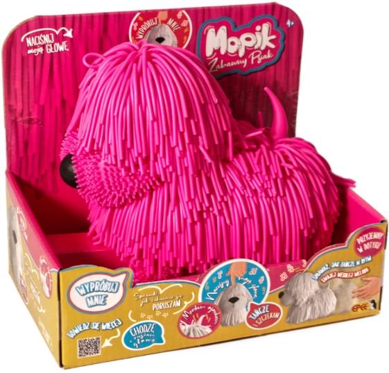 Poznaj Mopika – najzabawniejszego psiaka na świecie! Naciśnij jego główkę i rozpocznij prześmieszną zabawę. Zobacz, jak chodzi, porusza główką i merda ogonkiem. Mopik szczeka i odtwarza zwariowaną melodię. Wykonany z miękkiego, elastycznego materiału.