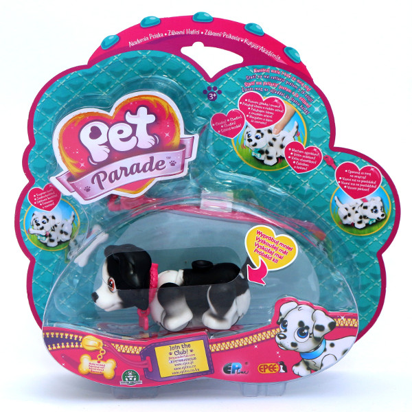 Pet Parade – Akademia Psiaka zupełnie nowa linia, która łączy dziecięcą miłość do piesków z innowacyjnymi funkcjami, zapewniającymi wspaniałą zabawę! Przycisk na grzbiecie psiaków wprawia je w ruch: poruszają pyszczkiem, ogonem, uszami, a nawet chodzą! Kiedy zaczepisz im smycz od razu chętnie podrepczą na spacer! Psiaki zaopatrzone są w dwa magnesy, dzięki którym jest interakcja z akcesoriami. Pierwszy pozwala im na trzymanie w pyszczkach kości, drugi zaś umożliwia przymocowanie smyczy do obroży. Przygarnij Psiaka, trenuj go i baw się z nim! Każdy Psiak posiada identyfikator w kształcie kości przyczepiony do obroży, na którym można zapisać imię pupila! Wybierz swojego ulubionego psiaka lub zbierz je wszystkie!