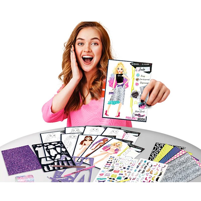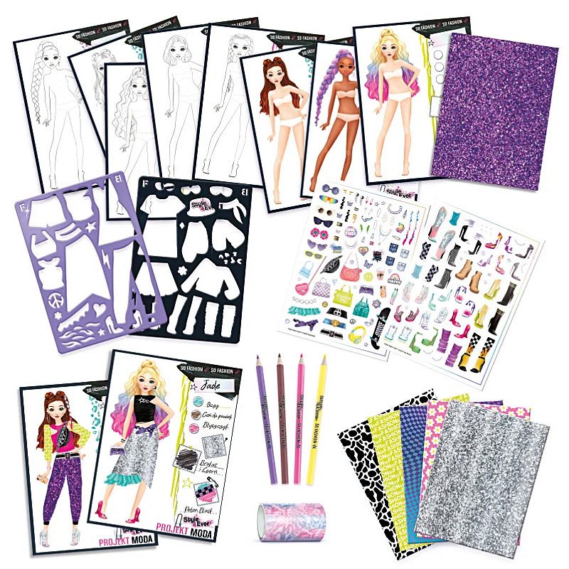 Zestaw do projektowania mody zawiera wszystkie niezbędne narzędzia i akcesoria, takie jak kredki, naklejki, wzorniki tkanin, szablony i wiele innych. Zestaw zawiera także książeczkę z przykładami projektów i pomysłów, która może dostarczyć inspiracji młodym projektantom.