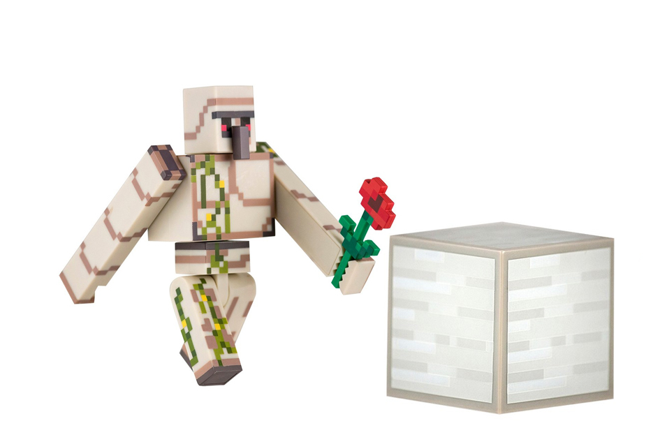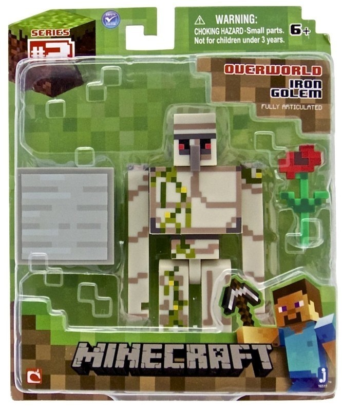 W zestawie znajdziemy ok. 9,5 cm figurkę ron Golema z czerwonymi oczyma, blokiem żelaza i różą, który możemy umiescić w ręku figurki. Iron Golem rusza rękoma i nogami, a nogi możemy obracać o 360 stopni.
