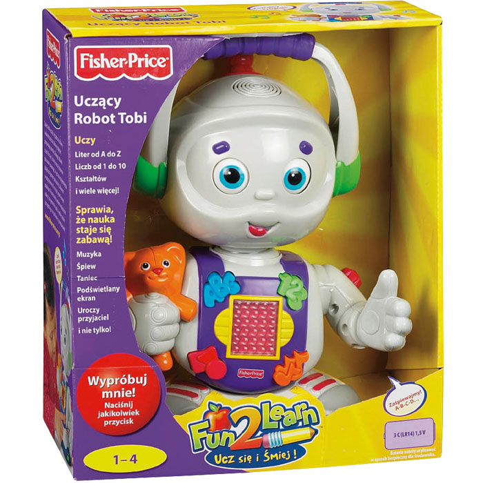 Uczący Robot Tobi z serii Fun2Learn to nowy interaktywny przyjaciel Twojego dziecka. Maluszek może wciskać przyciski wokół świecącego ekranu aby nauczyć się alfabetu, literek oraz kształtów! Naciskając na nutkę dziecko może zaśpiewaj wraz z Tobim jedną z 3 zabawnych piosenek!