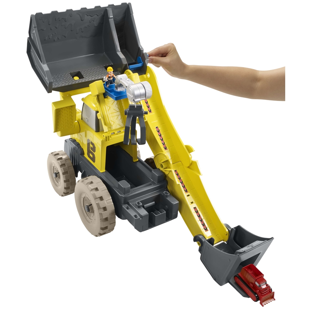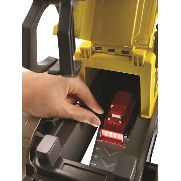 Koparka spełni także funkcję garażu dla aż dwunastu pojazdów (dostępne osobno). Przekształcanie maszyny jest bardzo proste - po zdjęciu tylnego zderzaka dzieci otrzymają platformę, z której za pomocą dźwigu będą mogły zabrać pojazdy, które następnie mogą zjechać po rampie! Teraz można już przystąpić do wszystkich prac budowlanych!