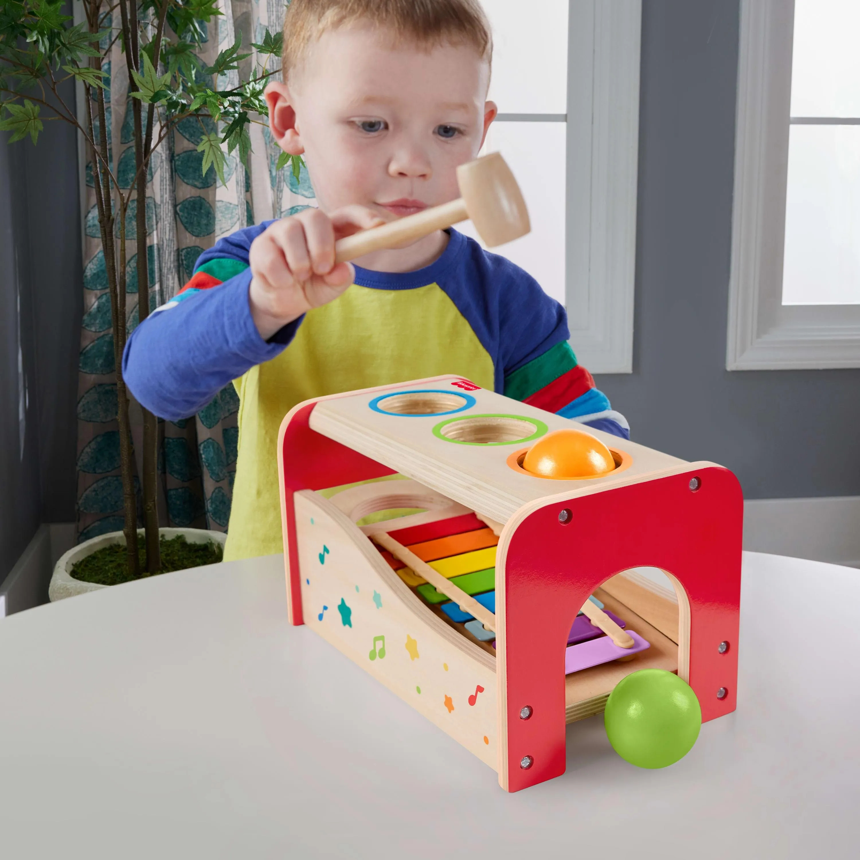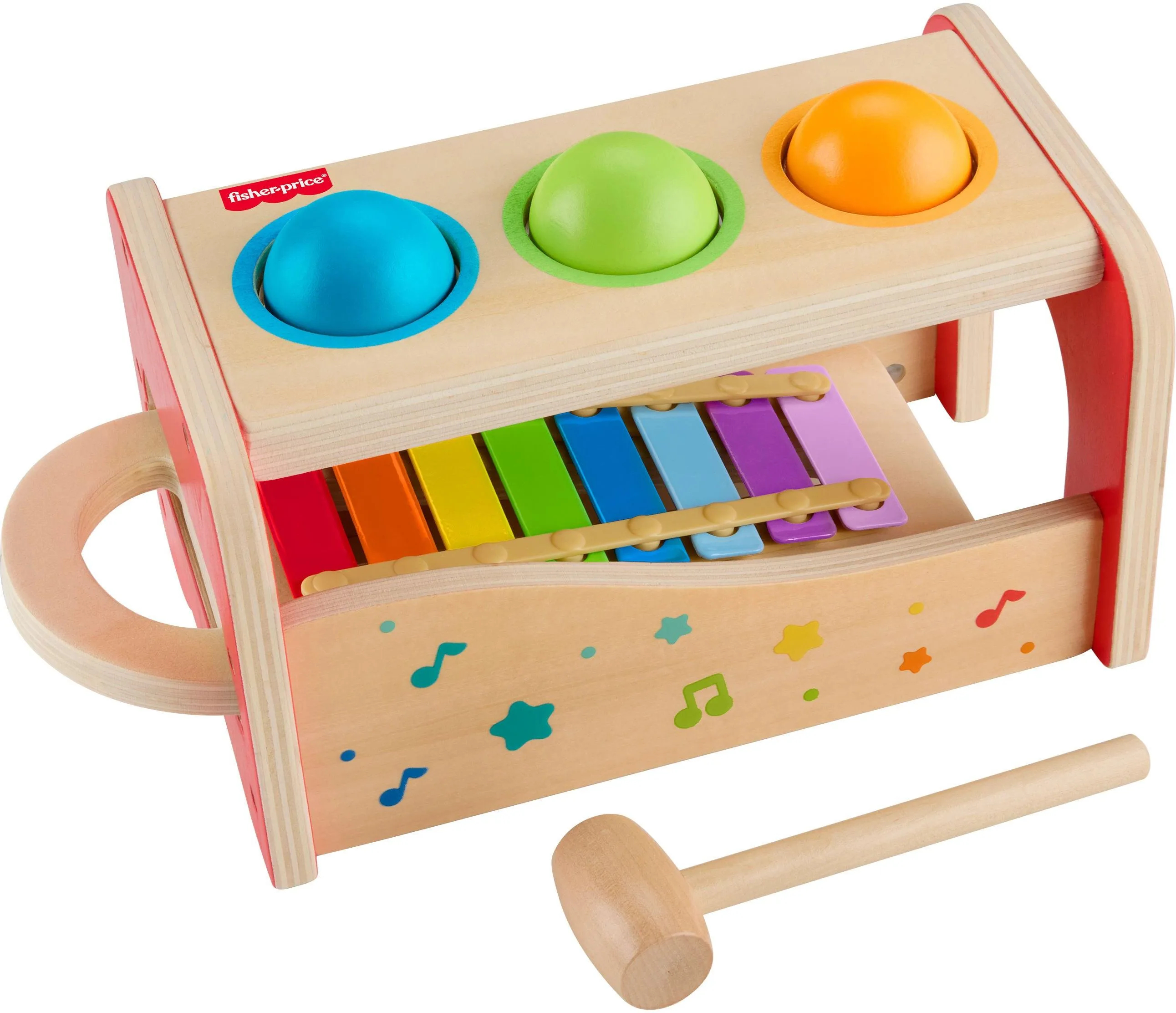 Drewniana zabawka dla maluchów firmy Fisher-Price to dwie zabawki w jednej! Dzieci mogą uderzać lub przepychać kulki przez otwory, aby uderzały w cymbałki, albo wyjąć cymbałki i grać na nich samodzielnie. Ta zabawka muzyczna zapewnia mnóstwo zajęć praktycznych i jest świetnym sposobem na pobudzanie kreatywności dziecka, pomagając jednocześnie rozwijać jego zdolności motoryczne.