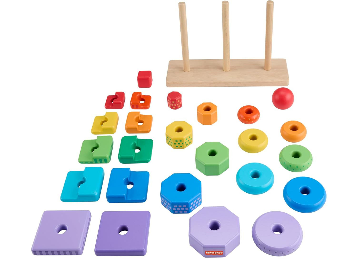 Zabawa potroi się dzięki tej drewnianej zabawce do układania i sortowania dla maluchów marki Fisher-Price®. Zestaw zawiera łatwe do uchwycenia drewniane kółka, ośmiokąty oraz dwuczęściowe prostokąty geometryczne, które można sortować i układać na podstawie. Ta zabawka do układania, to świetny sposób na zapoznanie dziecka z rozmiarami, kolorami, kształtami i nie tylko!