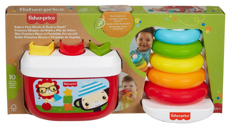 Czas na EKO zabawę! Ten eko zestaw prezentowy od Fisher-Price® łączy dwie klasyczne zabawki dla małych dzieci wykonane z materiałów pochodzenia roślinnego*. Zbuduj własny świat zabawy z Pierwszymi klockami malucha – w zestawie jest 10 kolorowych klocków o różnych kształtach, które można sortować, układać i wkładać do pojemnika przez otwory w wieczku. Ulubiona Piramidka z kółek ma podstawę, którą można rozbujać, trącając w nią rączką, oraz 5 kolorowych kółek do chwytania i układania. Ten uroczy zestaw prezentowy jest pełen aktywizującej zabawy, która pomaga rozwijać zręczność, koordynację ręka-oko i umiejętność rozwiązywania problemów. (*Zabawki wykonane w co najmniej w 90% z materiałów biopochodnych pozyskanych z trzciny cukrowej).