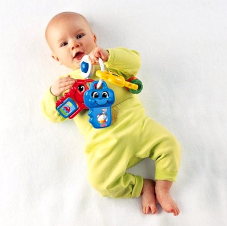 Każda barwna i radosna postać to inna świetna zabawa! Trzy uśmiechnięte kluczyki z serii Brilliant Basics grzechoczą i klikają zapewniając maluchowi nieustanną zabawę. W jednym z nich znajduje się muzyczna niespodzianka. Zabawka wspomaga rozwój umiejętności motorycznych, koordynacji wzrokowo-manualnej oraz umiejętności słuchowych. Dodatkowo zabawkę można przyczepić do wysokiego krzesełka, huśtawki, wózeczka czy fotelika samochodowego. Wymagane 3 baterie LR44