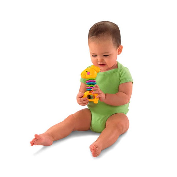 Na giętką szyję żyrafy nałożone są kolorowe krążki. Gdy dziecko porusza zabawką, żyrafa kiwa głową, a krążki wydają klekoczący dźwięk. Wspaniała zabawa, która przyspiesza rozwój dziecka! Bawiąc się żyrafą ma możliwość gryzienia i dotykania elementów o różnej strukturze.