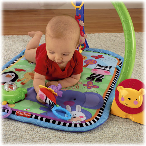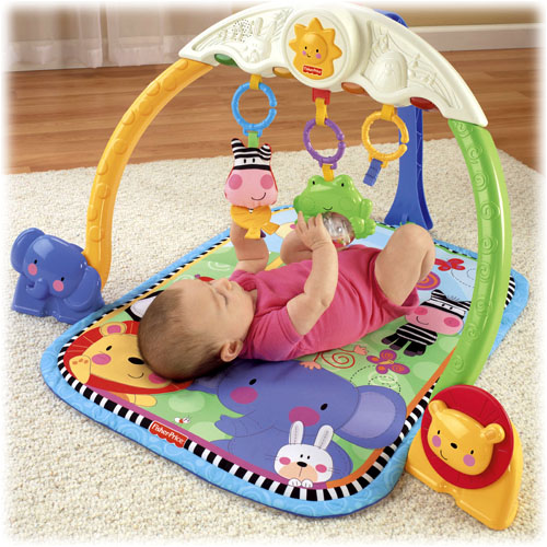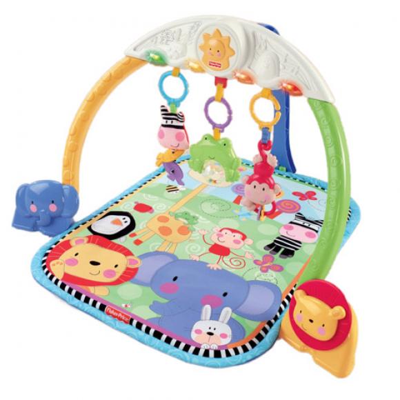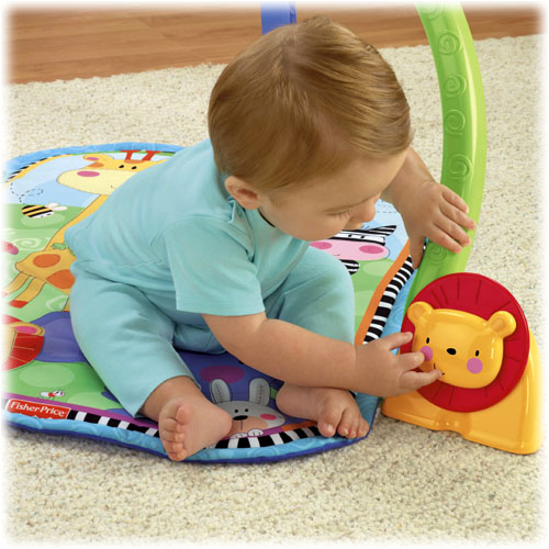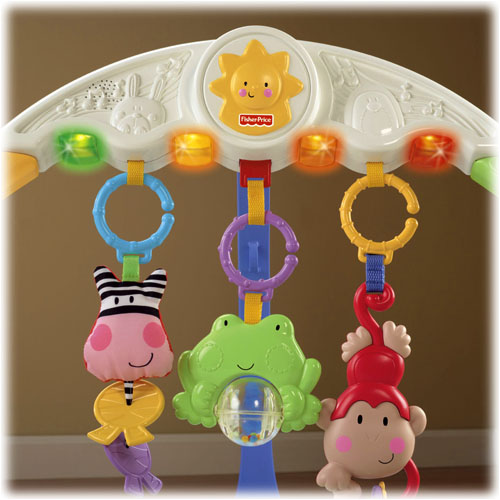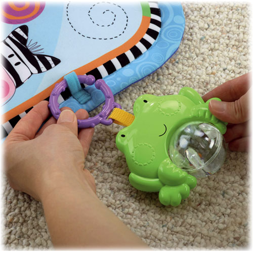 Do łuku przymocowane są 3 wiszące zabaweczki: zebra z grzechoczącą rybką, małpka z grzechoczącymi koralikami i żabka z kolorową kulką z koralikami. Gdy dziecko potrąca żabkę, uruchamia efekty dźwiękowe i melodyjki. Dodatkowe 2 zabawki są umieszczone na wysokości dziecka, na dole po obu stronach podstawy łuku. Są to: kiwający się słonik oraz obracający się lew.