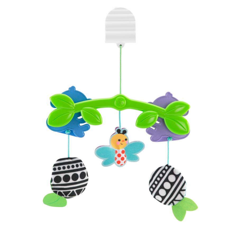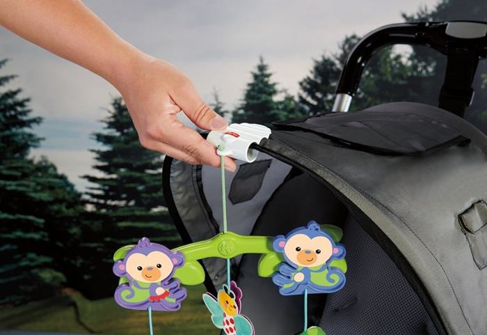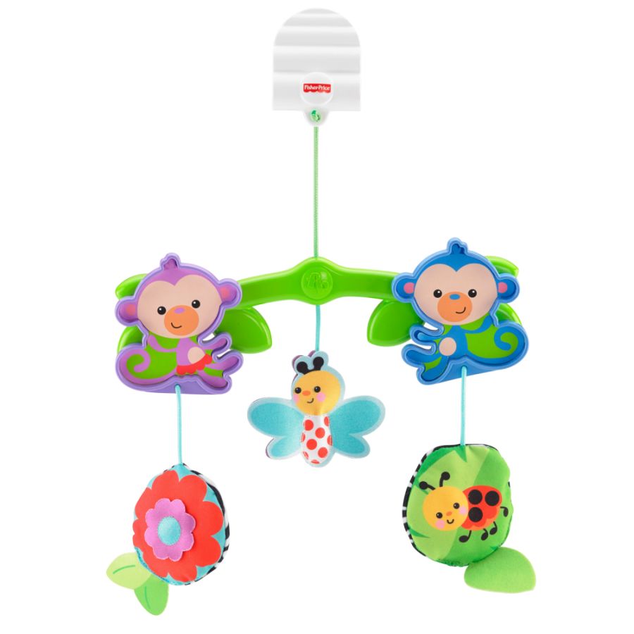 Kolorowa, przenośna karuzela do wózka. Wystarczy przymocować ją do daszka wózeczka, by dziecko mogło trącać zabawki rączką i cieszyć się odgłosami dwóch miękkich biedroneczek i ślicznego kwiatka. Przyjazne małpki huśtają się w rytm ruchów wózka.